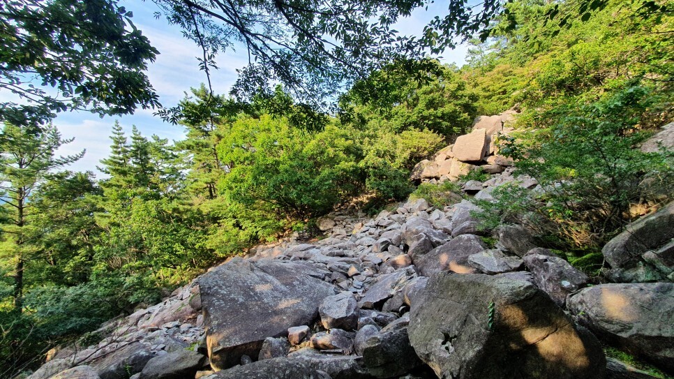 아.. 먼가 이런지형 나타나면 애좀 먹는다. 어디가 등산로야..? ㅋㅋ 지금 기억에 이 암석을이 나타났을때 암석으로 계속 가면안돼고 진행방향의 우측을 좀 살펴보면 거기에 길이 있다. ㅋㅋ 나도 여기 암석지대로 들어갔다가 에..? 길 없는데..? 하고 뒤로 후진해서 다시 찾아보니까 우측에 있더라.. 길 잃을수도있으니 조심하길..