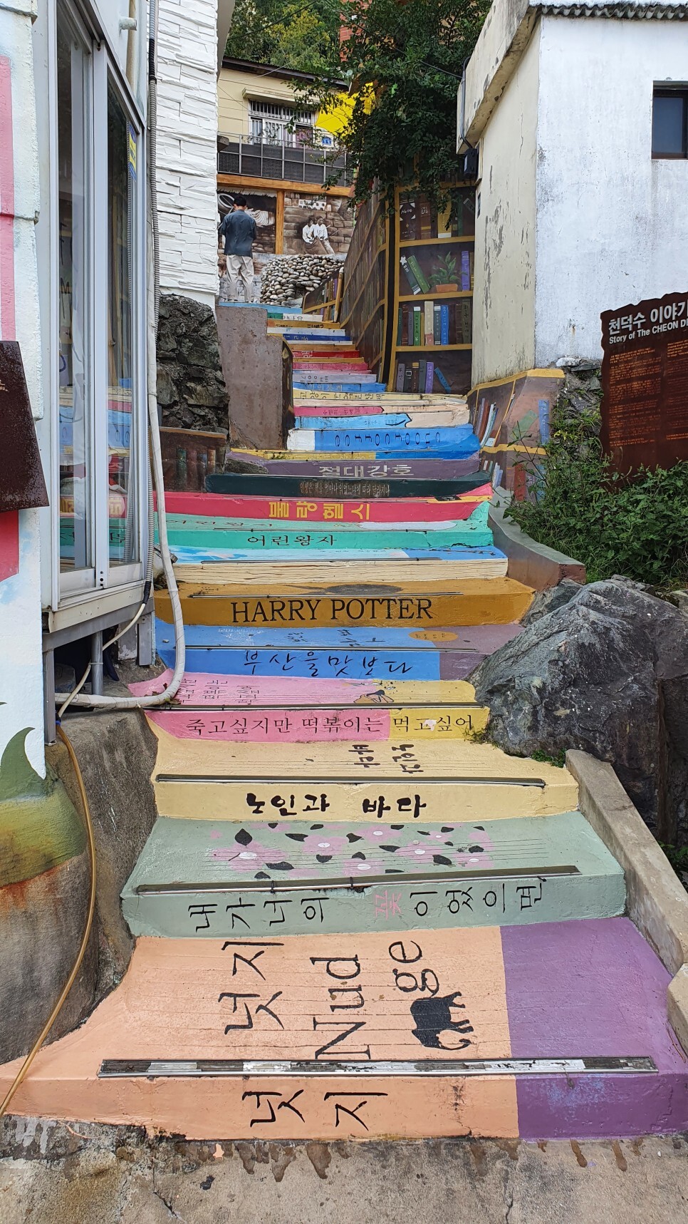 먼가 지저분하던 계단을 시간이 오래 바랜 책들처럼 잘 표현해놨다.