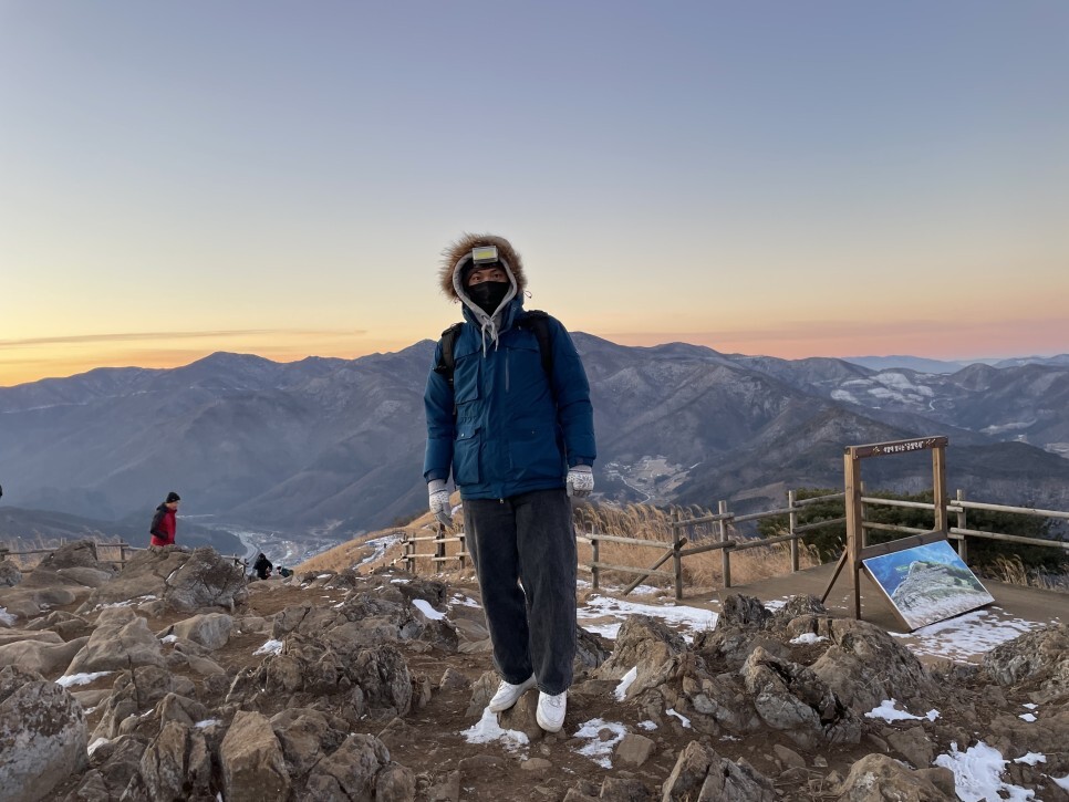 나도 한컷..항상 산올라 갈때 더워서 겉옷 들고올라가서 이번에도 그럴까봐 후드를 안입고 올라오려고했었다. 근데 진짜 이번에 안입고 올라왔으면 추워서 죽을 뻔했다 ㅠㅠ 아래가 영하 13도였고 여기는 한 체감 영하 15~20도 사이 같았다 진짜로... 바지는 두겹이라 버틸만했는데 발가락은 진짜 안움직이니까 바로 동상오는 느낌이 들었다 ㅠㅠ