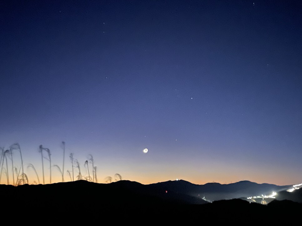 민둥산 한줄 후기 : 야간산행 재밌다. 그리고 분홍 하늘도 좋았다. 달하고 여명도 좋았고 너무 재밌었다!