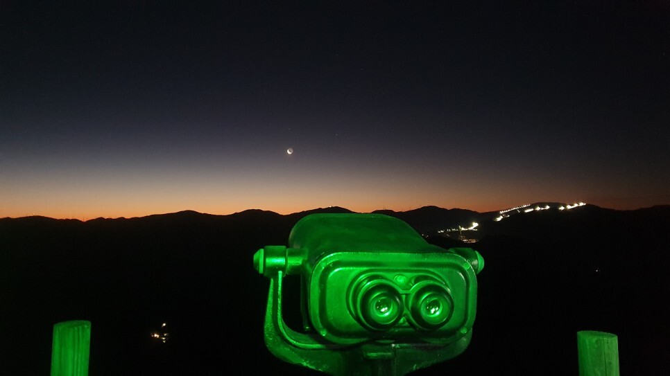 6시 43분..! 출발 약 한시간 반만에 정상에 도착했다! 올라오니 공짜 망원경이 있던데 살짝 GOP 감성이다. 저거 잠깐 보는데 손가락 터지는줄 알았다