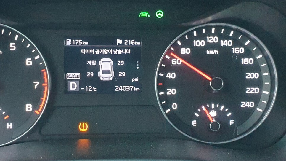윽...기온이 얼마나 내려갔는지 TPMS 경고등도 점등됐다. 다행히 타이어에는 문제가 없었고 서울 올라와서 공기압 다시 맞추고 꺼졌다.