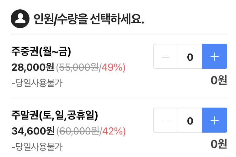 일단 네이버 예약 기중 평일 2.8만원이다. 두명하면 5.6만원..! ㅋㅋㅋ 근데..나는 회사 콘도로 예약하고 갔기 때문에 법인회원 할인이 가능했다. 머.. 드라마틱한 차이는 없었고.. 당일 현장결제 했을 때 5.5만원이었다. 아마 네이버 사전 예약이 아닌 당일에 할인 없이 구매하면 3.1이었나 머 몇천원 차이가 있었던거 같긴한데.. 암튼.. 큰차이는 없다. 걍 한 두명가면 5만원돈 드는구나 생각하면 된다.