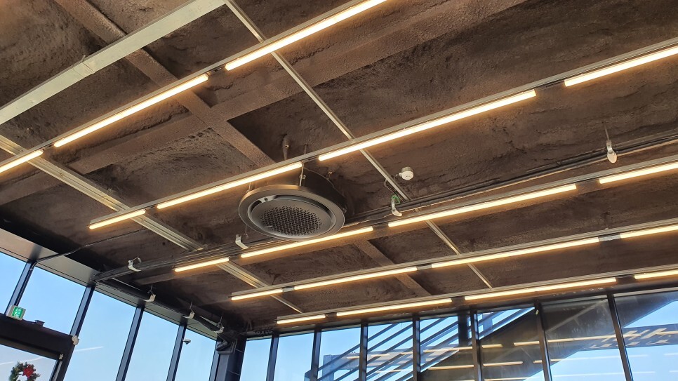 천장의 선형 조명들과 건물톤, 에어컨 디자인이 조화를 이뤄보였다.