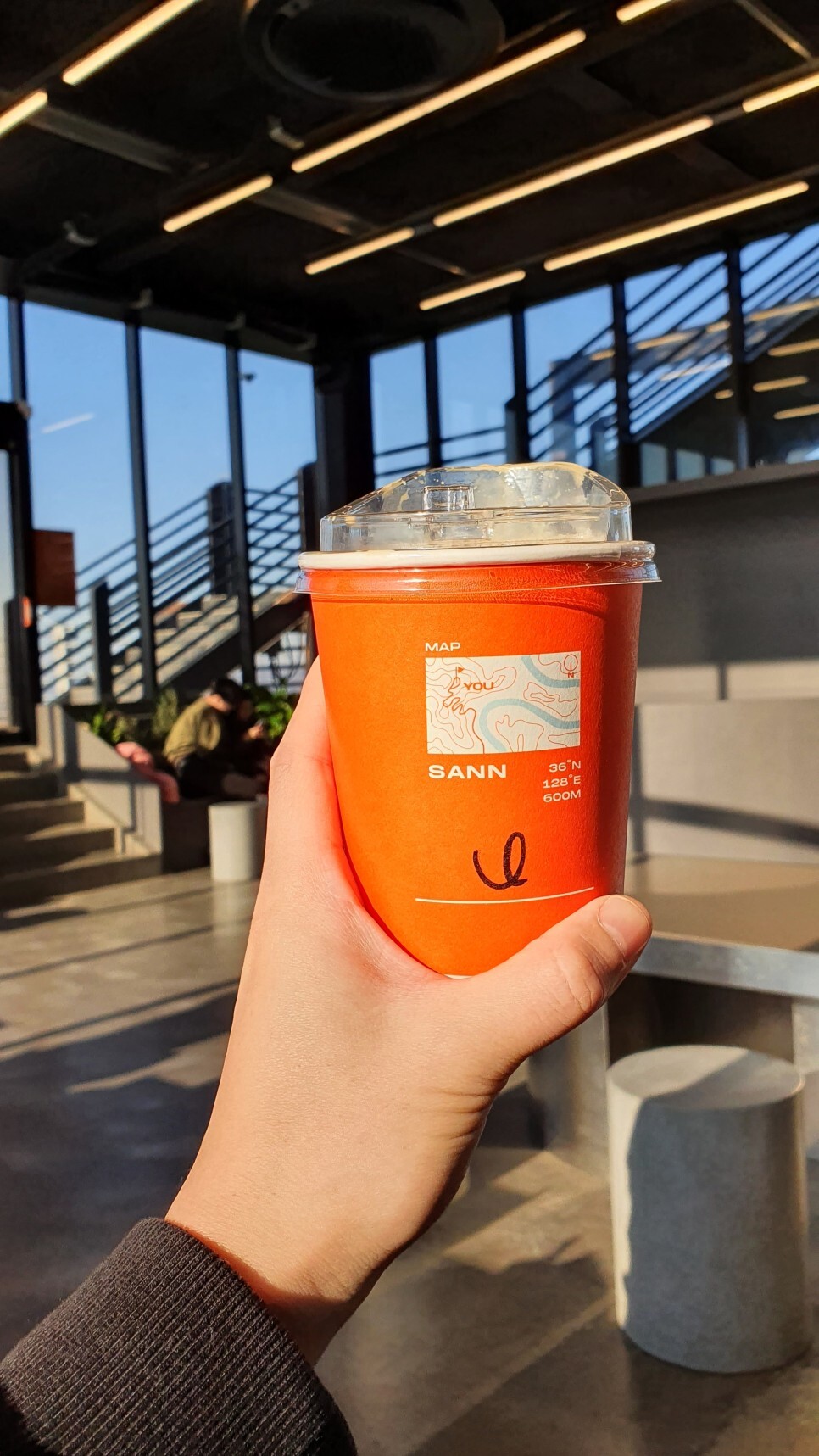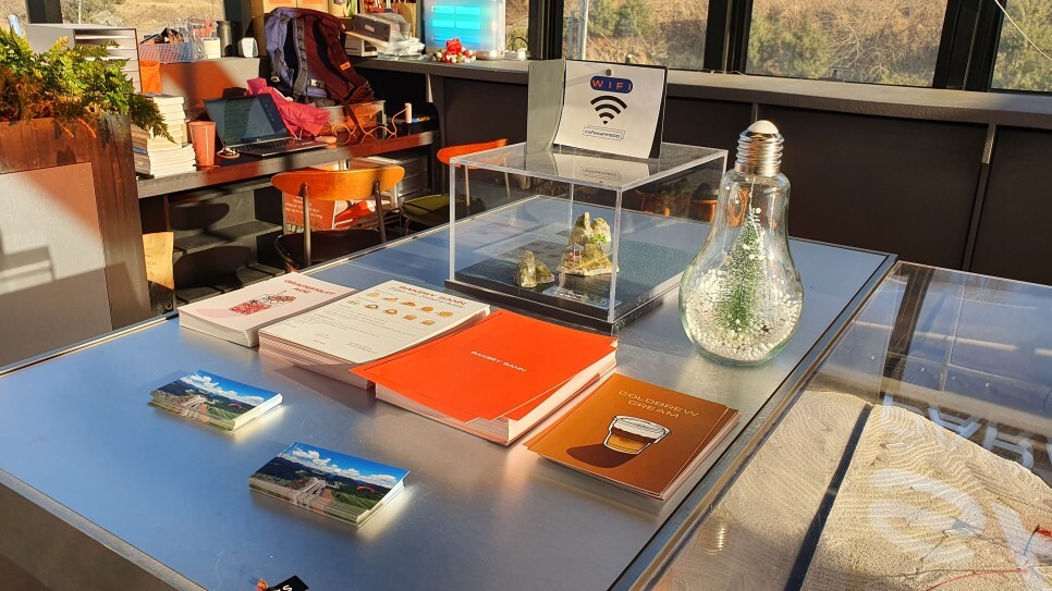 실제 카페산 앞에 있는 남한강 자락의 지형도를 그려 넣었더라..! 색상이나 인테리어 조합하는 감각이 뛰어난 것 같다.