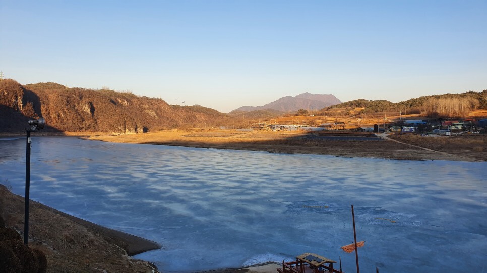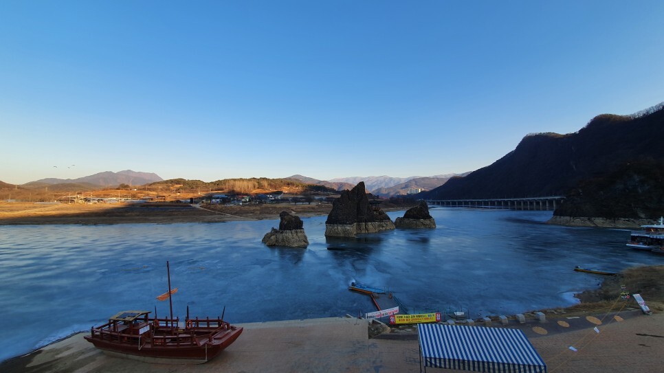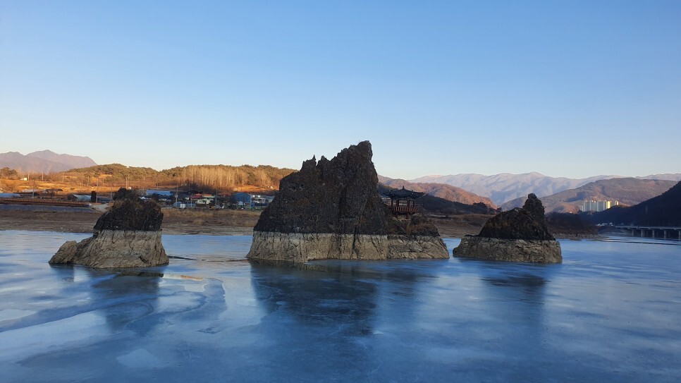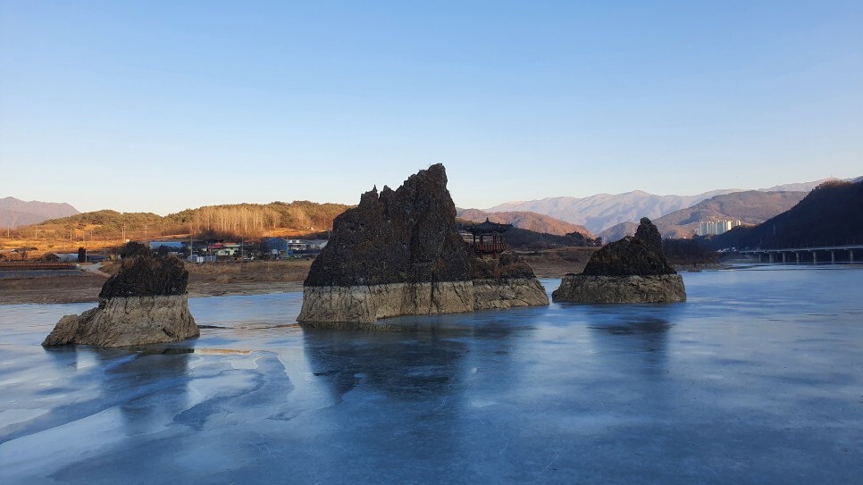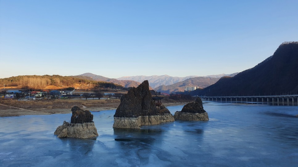 얼어버린 겨울의 남한강위에 솟아있는 도담삼봉..!