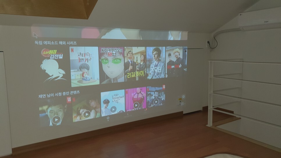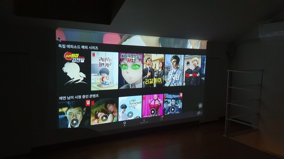 딱 켜서 넷플을 켰는데.. 앞사람 계정으로 이미 로그인되어있었다. 혹시나 이거 사용하시는 분들은 체크아웃하기 전에 꼭 빌프로젝터에서 개인계정들 로그아웃하길 바란다. 빌프로젝터는 모니터처럼 화면 출력만 하는게아니고 안드로이드 OS 가 내장되어있어 자체적으로 OTT 로그인을 해서 볼 수 있었다.