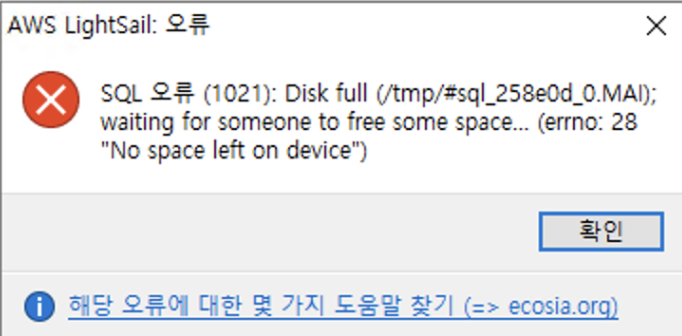 💡 SQL 오류 (1021): Disk full (/tmp/#sql_258e0d_0.MAI); waiting for someone to free some space… (errno: 28 “No space left on device”)