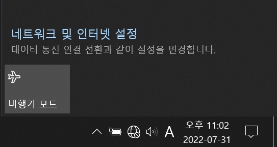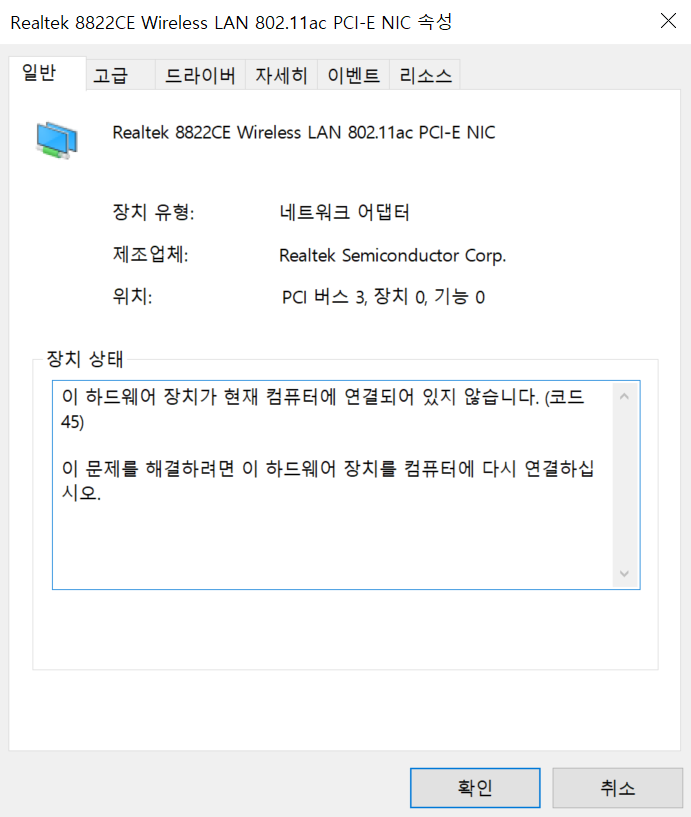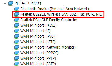 인터넷 아이콘을 눌러보면 위처럼... 아예 WIFI 무선랜 어댑터가 보이지 않았다.. 동시에 블루투스 어댑터도 없어졌다.. 참고로 WIFI와 블루투스 모듈 모두 리얼택 8822CE 한 장비에 모여있다. 즉.. 8822CE 어댑터와 통신이 이상하다는 얘기..!
