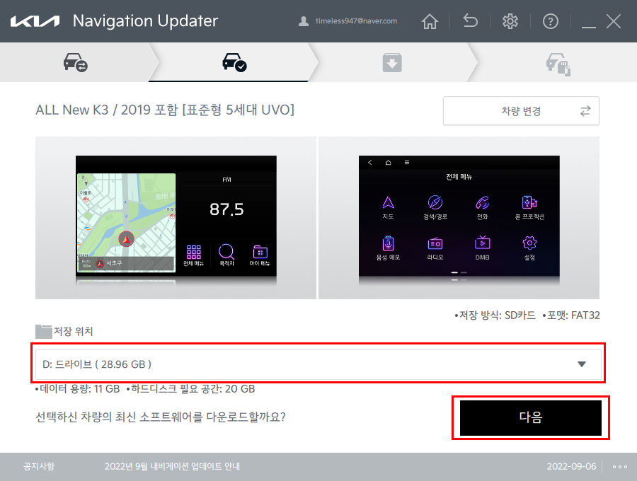 진행하기 앞서 쓰레기 SD카드는 쓰지 말라는 안내가 나온다. 기존 차량에 달려있는 SD카드쓰는게 제일 좋다.