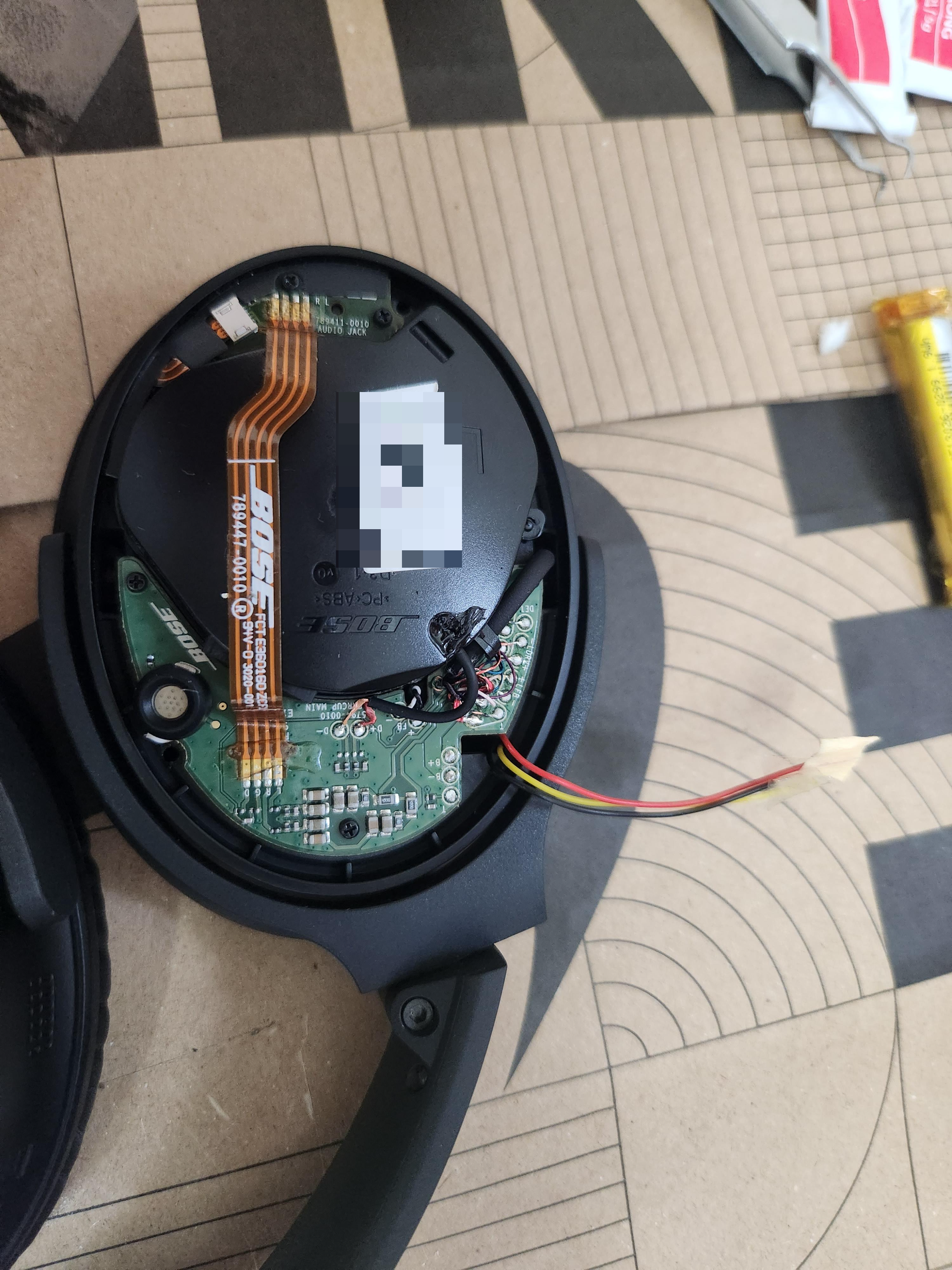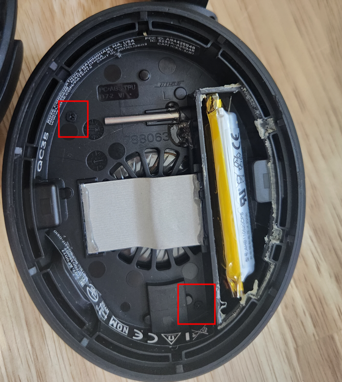 배터리 전선은 바깥 방향으로 빠져있다. 때문에 헤드폰 외부 덮개를 제거해야함으로 저 위 두 나사를 풀어주자. 그리고 바깥 덮개를 살짝 흔들면 외부 덮개가 쉽게 분리된다.