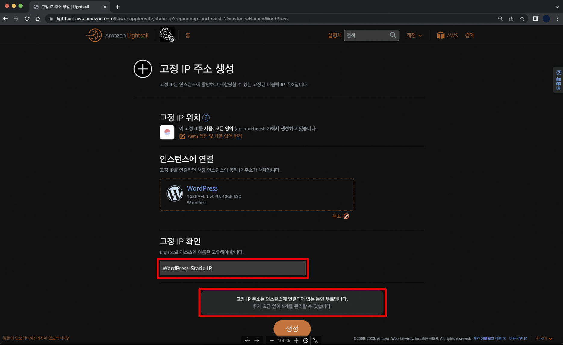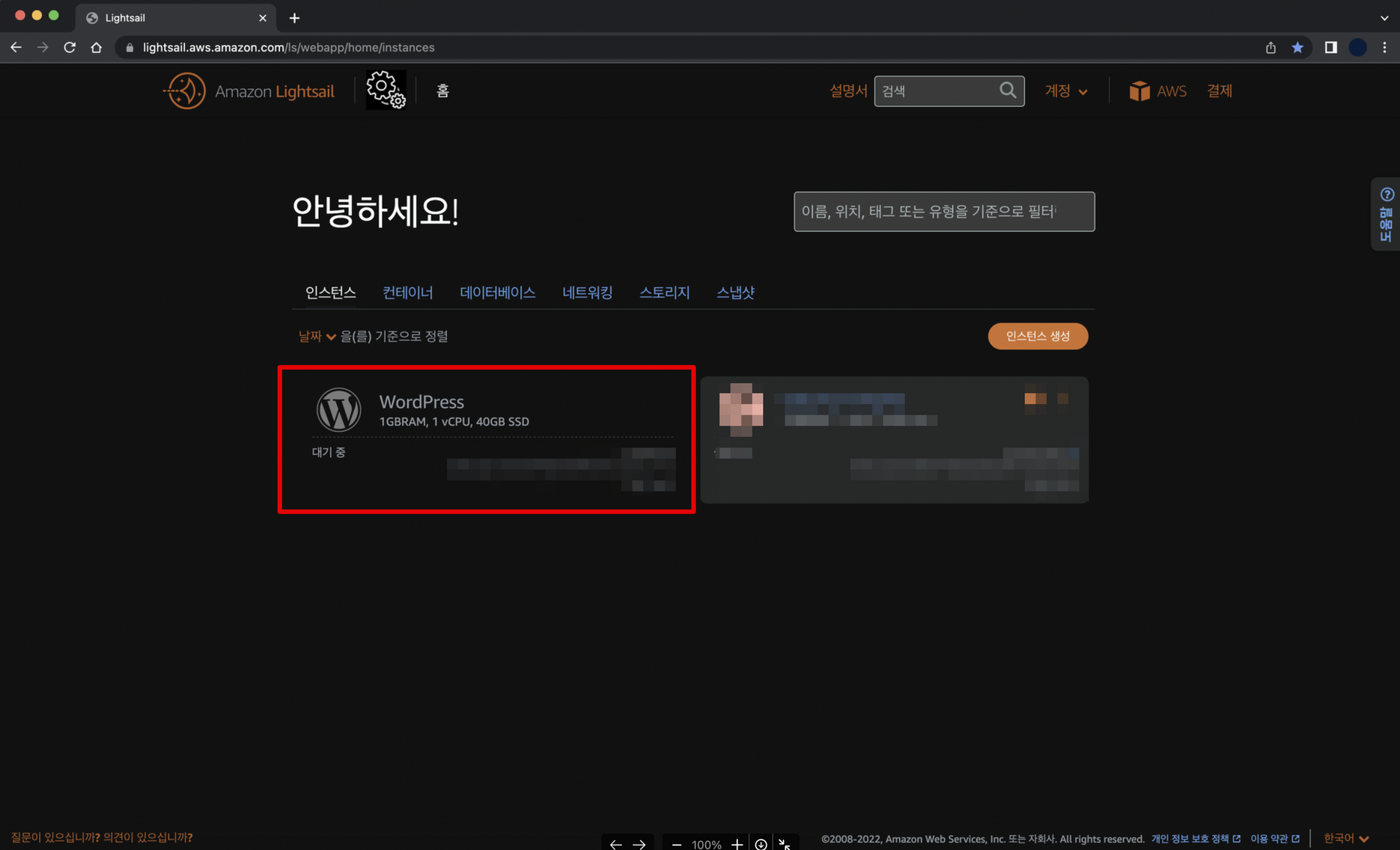 - 그래서 선택한게 라이트세일이다… 이미 청사진(Blueprint)가 있기 때문에 서버 만들때 “뭐 어떤 서버 만들껀데?” 를 물어보는데 거기서 WordPress 아이콘 한번 누르고 만들기를 누르면 블로그 구축이 되어 있는 상태로 서버를 생성해준다….. 확실히 이런 편리함은 EC2에 비해 좋다!