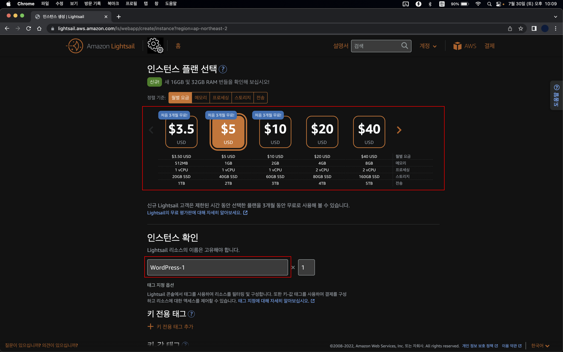 요기서 요금제를 골라주면된다. 나는 AWS에 단 1달러 내는것도 부담돼!!!!!!!!!!하면 바로 3.5달러짜리 누르면 된다.