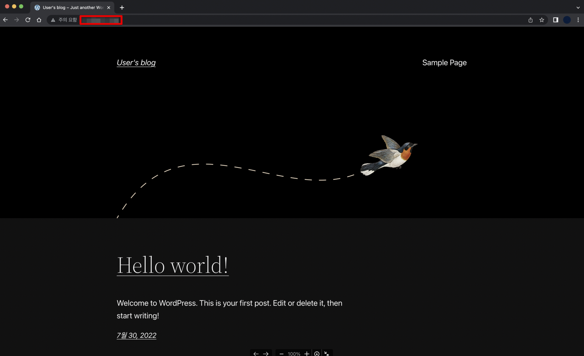 이제 관리자 페이지를 나와서 본인 워드프레스 서버의 IP주소를 브라우저에서 쳐보자! 그럼 기본적으로 세팅된 블로그가 출력된다! 지금은 IP로 접근가능한데 다음 포스팅에서 도메인과 연결하는 방법을 알아보자