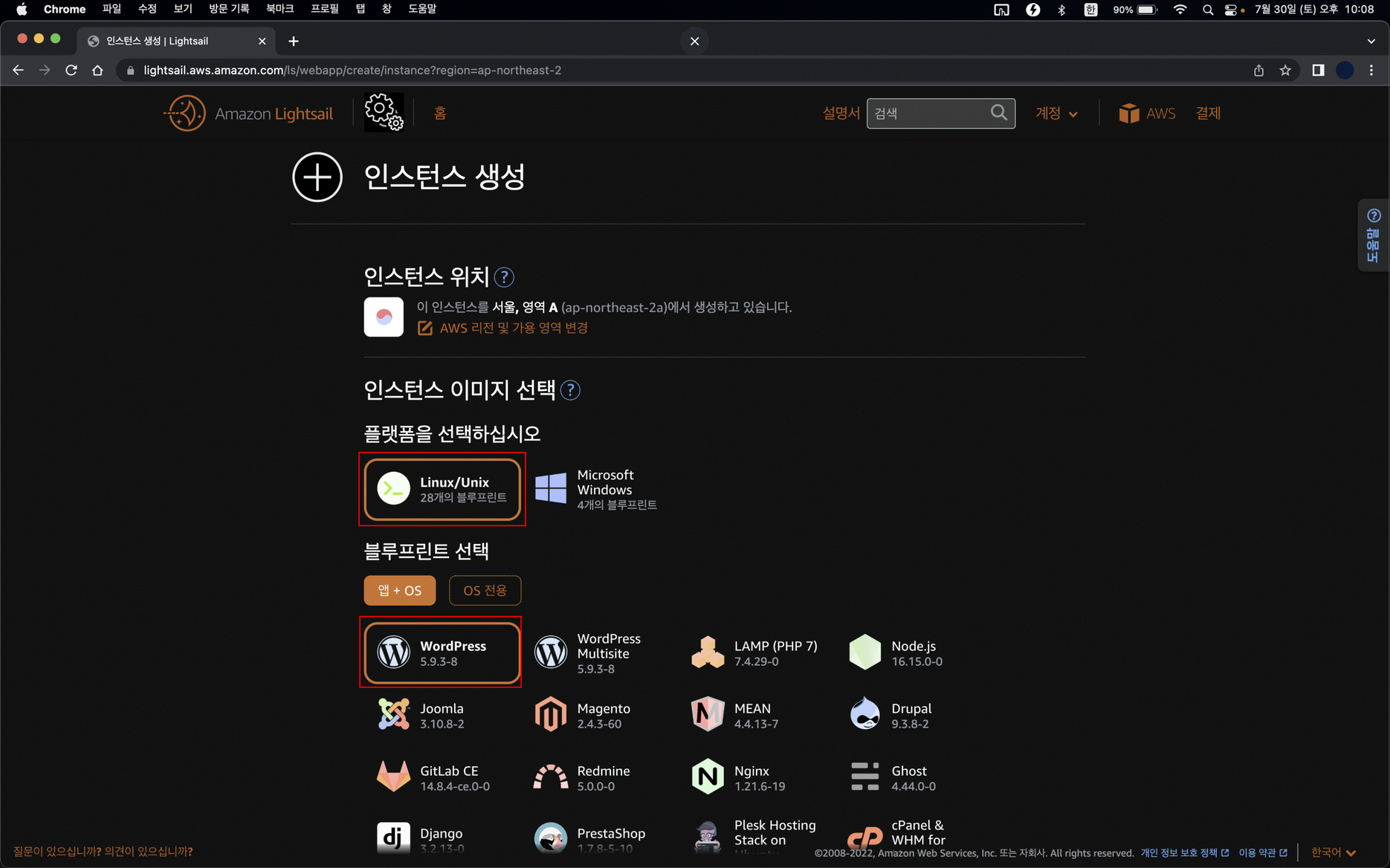 요부분이 아까 말했던 “쉽다!” 라는 요소다. 워드프래스 말고도 Nginx나 Django 등 다른 어플리케이션도 바로 이미지형태로 부어 서버 셋업을 할 수 잇다. 우리는 플랫폼은 “Linux/Unix” 를 선택해주고 블루프린트는 “앱+OS” 탭에 “WordPress”를 선택해주자.