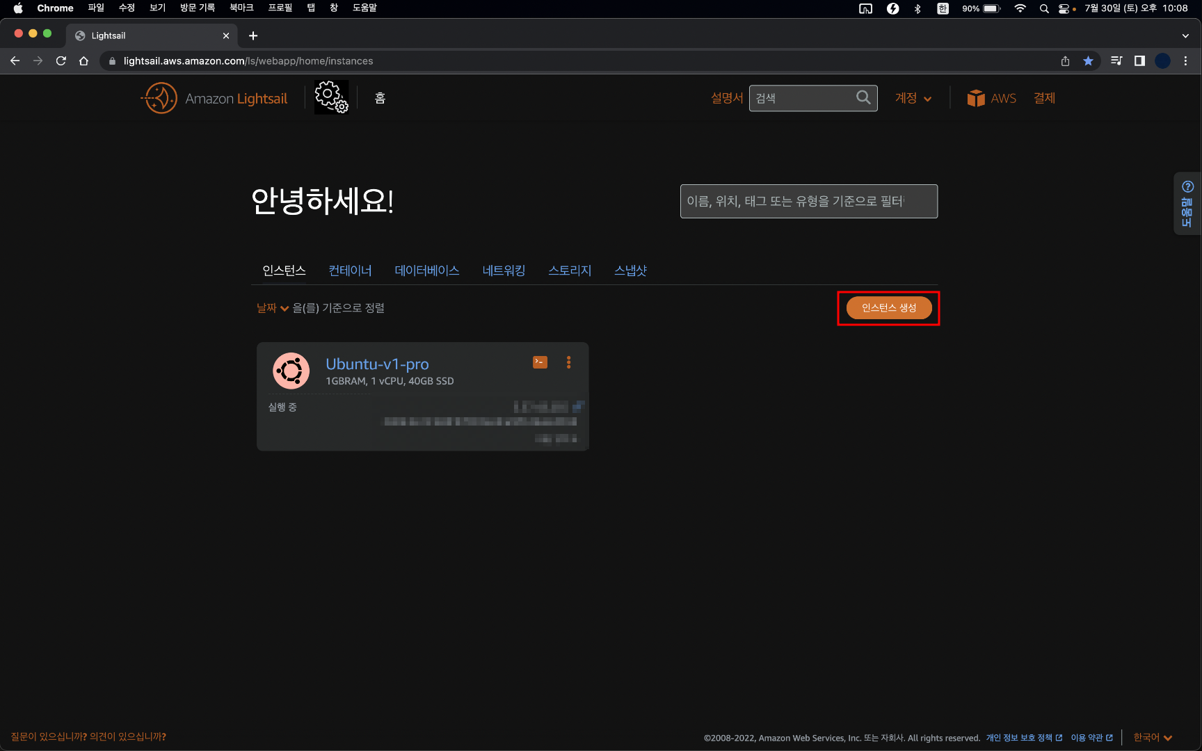 나는 기존에 운영하던 서버가 있기때문에 인스턴스 탭에 서버가 하나 잡힌다. 무시하고 중앙 우측에 있는 주황색 “인스턴스 생성”버튼을 눌러주자.