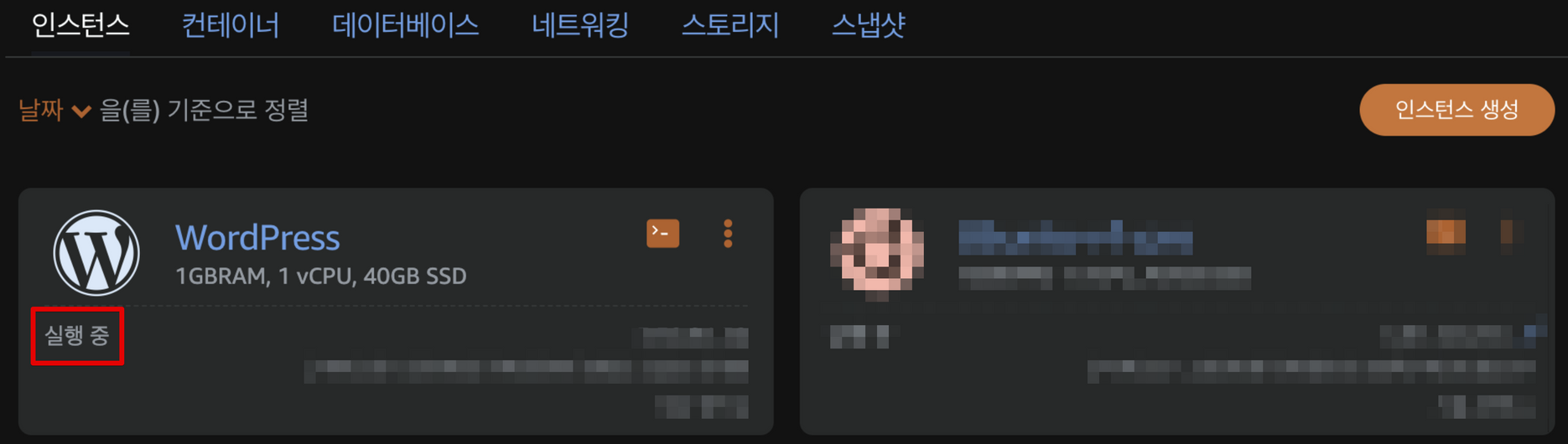 방금 생성한 인스턴스로 워드프레스 서버가 생성되며 초기에는 대기중으로 초기화 과정을 거친다.