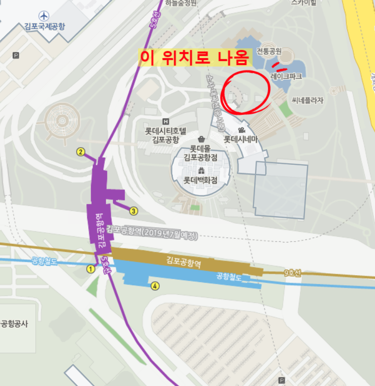 그리고 그린카 반납하고 가장 가까운 엘레베이터를 타고 밖으로 나오면 저위치로 나오게된다.. 육상으로 김포공항에 도달하려면 거대한 원형 롯데몰 건물을 삥 돌아서 가야했다.