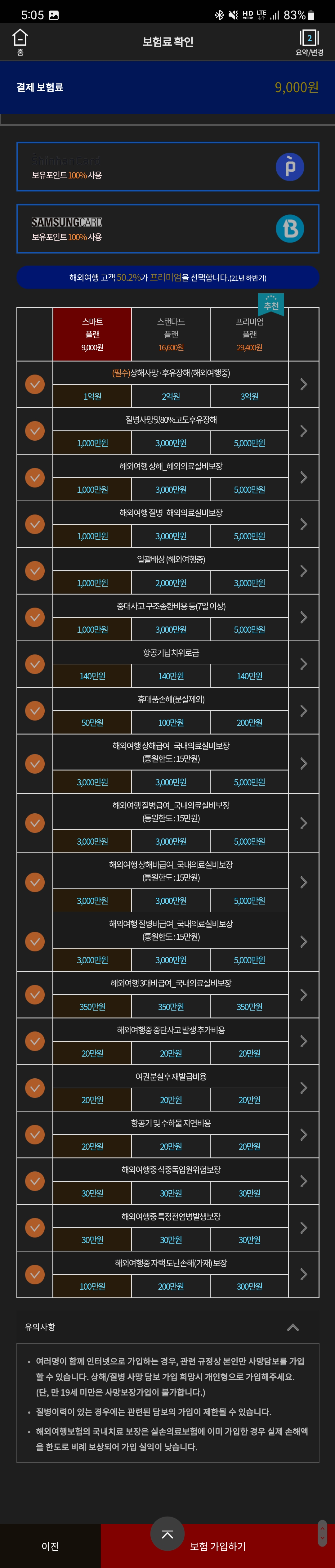 이걸 삼성화재에서 추가로 가입하려하면 실속플랜에는 적용되지 않는다고한다. 즉. 라이트 플랜에서는 해당 내용을 돈 더 주더라도 보장받지 못하는거다. 반면에 현대해상은 제일 낮은플랜에서도 위 항목들을 1500원더주고 다 보장해준다. 사실 제일 필요한게 이건데말이다 ㅎㅎ 그래서 바로 현대해상 선택! 그리고 현대해상에서 플랜 선택하고 필요없는 것은 체크해제해서 금액을 더 낮출수도있다. 근데 머 눌러도 몇백원씩 빠져서 그냥 9000원 짜리 가입했다.
