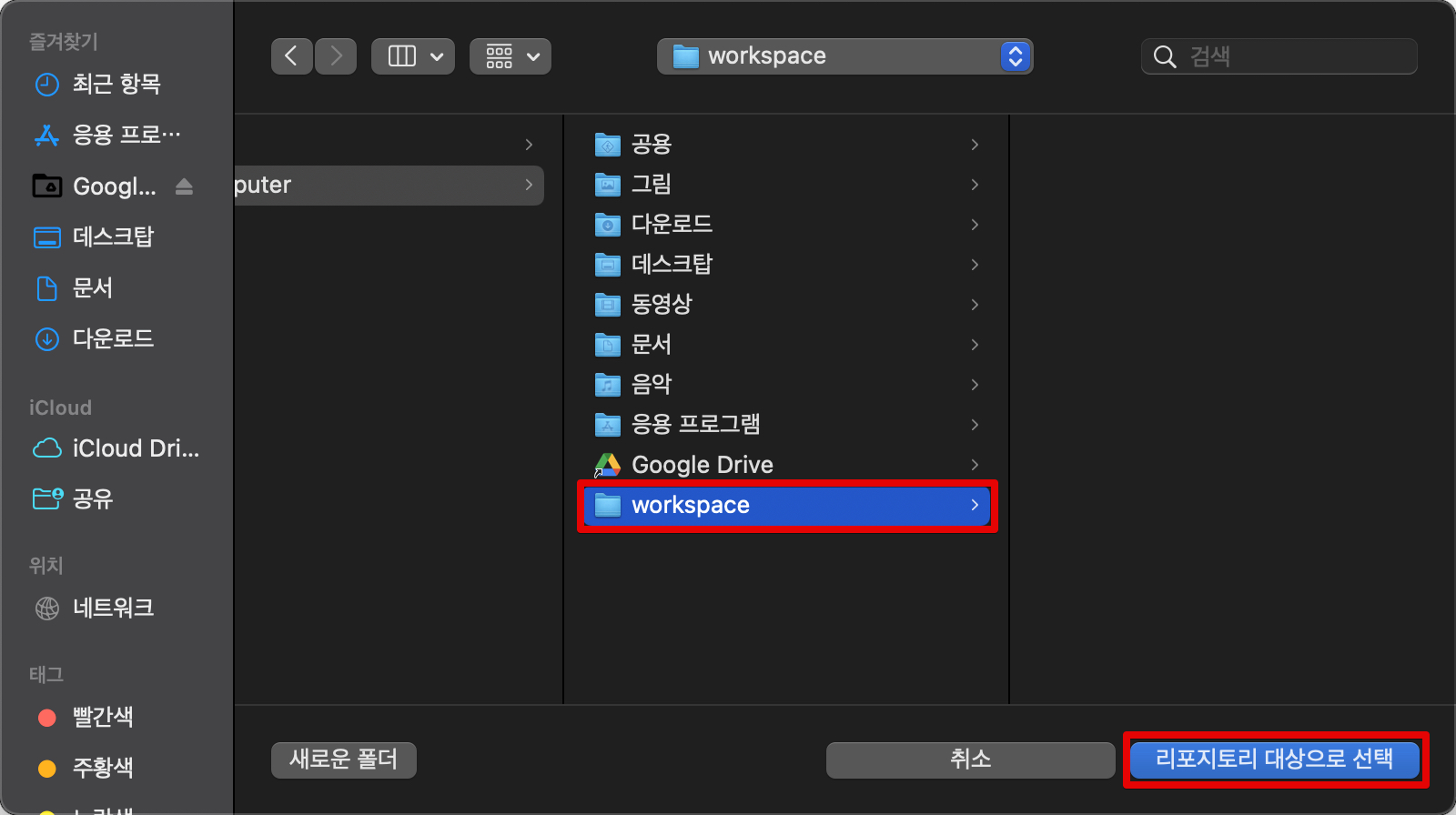 어느 위치에 저장할껀지 묻는다 나는 개발환경 국룰인 root 경로에 workspace 폴더를 만들어서 대상으로 선택했다. 원하는 경로를 선택 후 "리포지토리 대상으로 선택" 버튼을 누르면 된다.