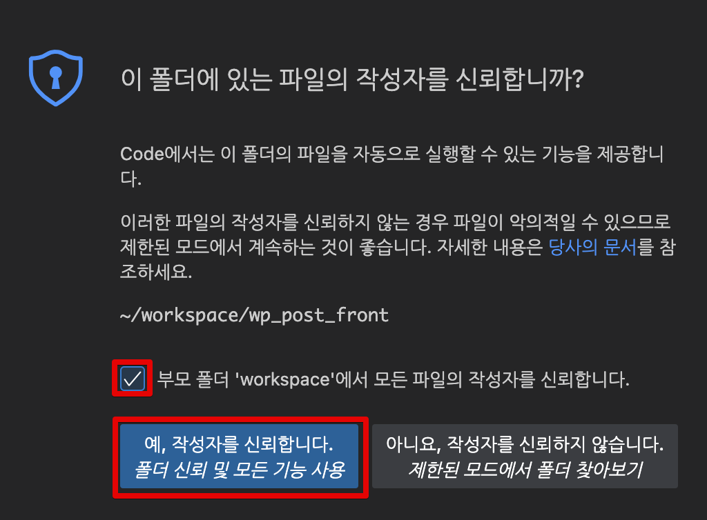 "이 폴더에 있는 파일의 작성자를 신뢰합니까?" 보안 경고가 나오는경우 상위 폴더까지 신뢰하기를 눌러주자.