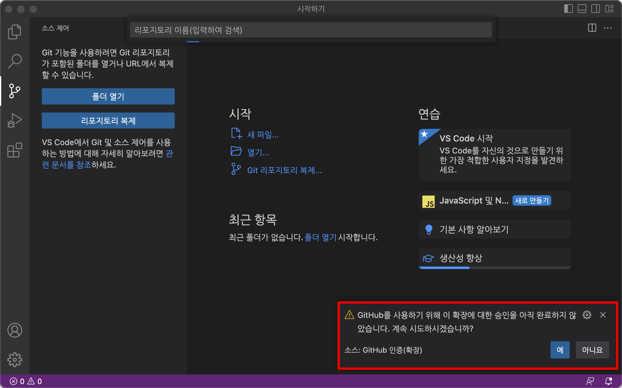 "GitHub를 사용하기 위해 이 확장에 대한 승인을 아직 완료하지 않았습니다. 계속 시도하시겠습니까? 소스: GitHub 인증(확장)" 창이 나오는 경우 "예" 버튼을 눌러주자.
