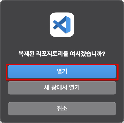 복제된 리포지토리를 VSC를 이용하여 바로 열꺼냐는 알림이다. 열기를 눌러주자.