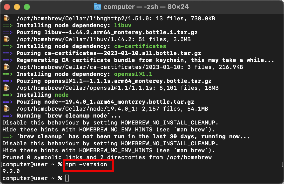 설치가 완료되면 npm -version 명령어를 이용하여 잘 설치되었는지 보자. 버전이 뜨면 설치가 된 거다. 함께 npm도 설치되었음으로 끝!