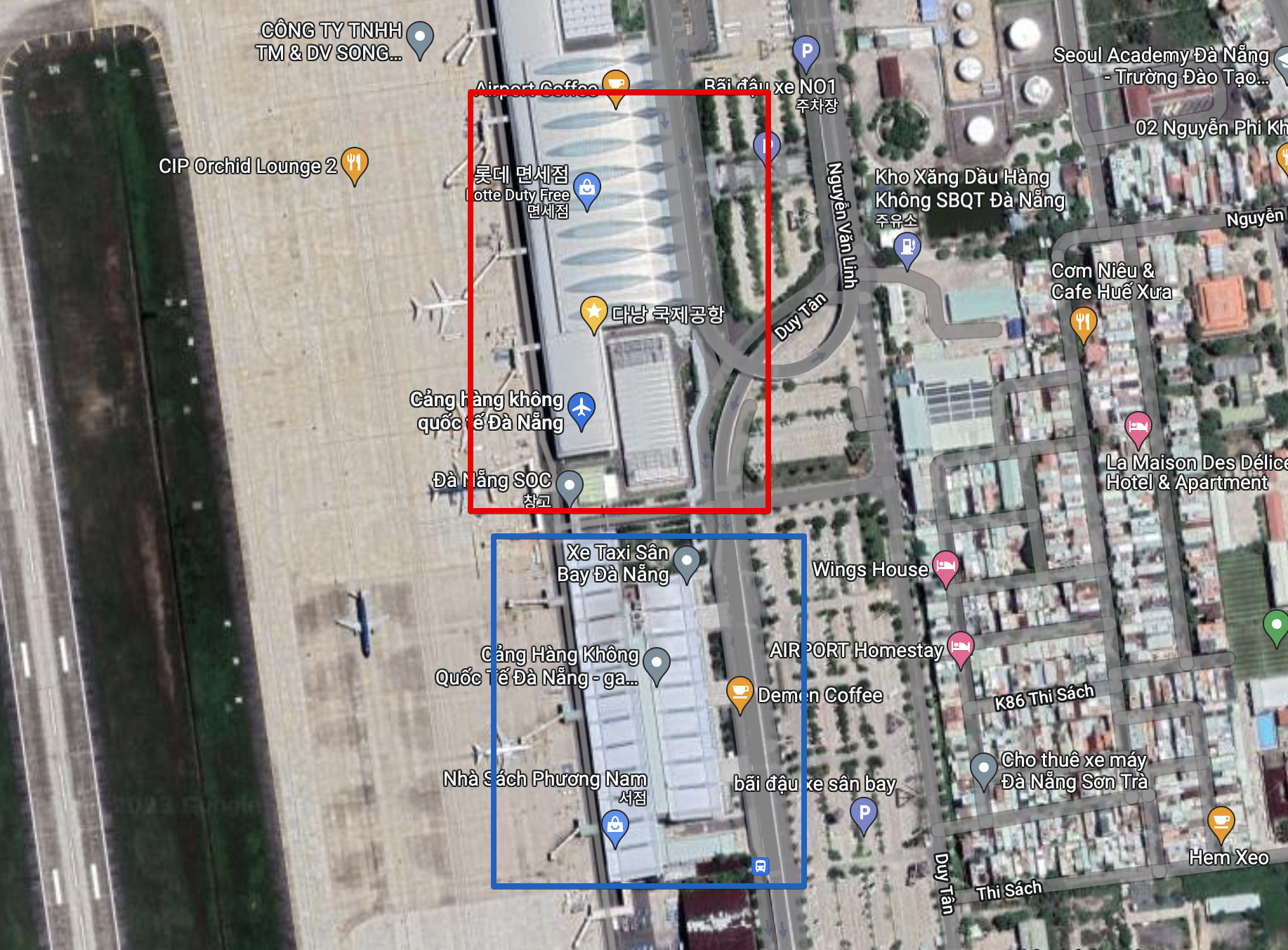 위 사진에서 붉은색 건물이 국제선 청사다. 국제선으로 검색이 안돼도 롯데면세점이 있는것을 보면 국제선 터미널이구나 유추가 가능하다. 반면에 아래 파란색 박스 건물이 바로 국재선 터미널이다. 우리는 다낭 > 호치민 구간을 국내선으로 이동해야하기 때문에 빨간 건물에 나와서 파란 건물로 이동해야한다.