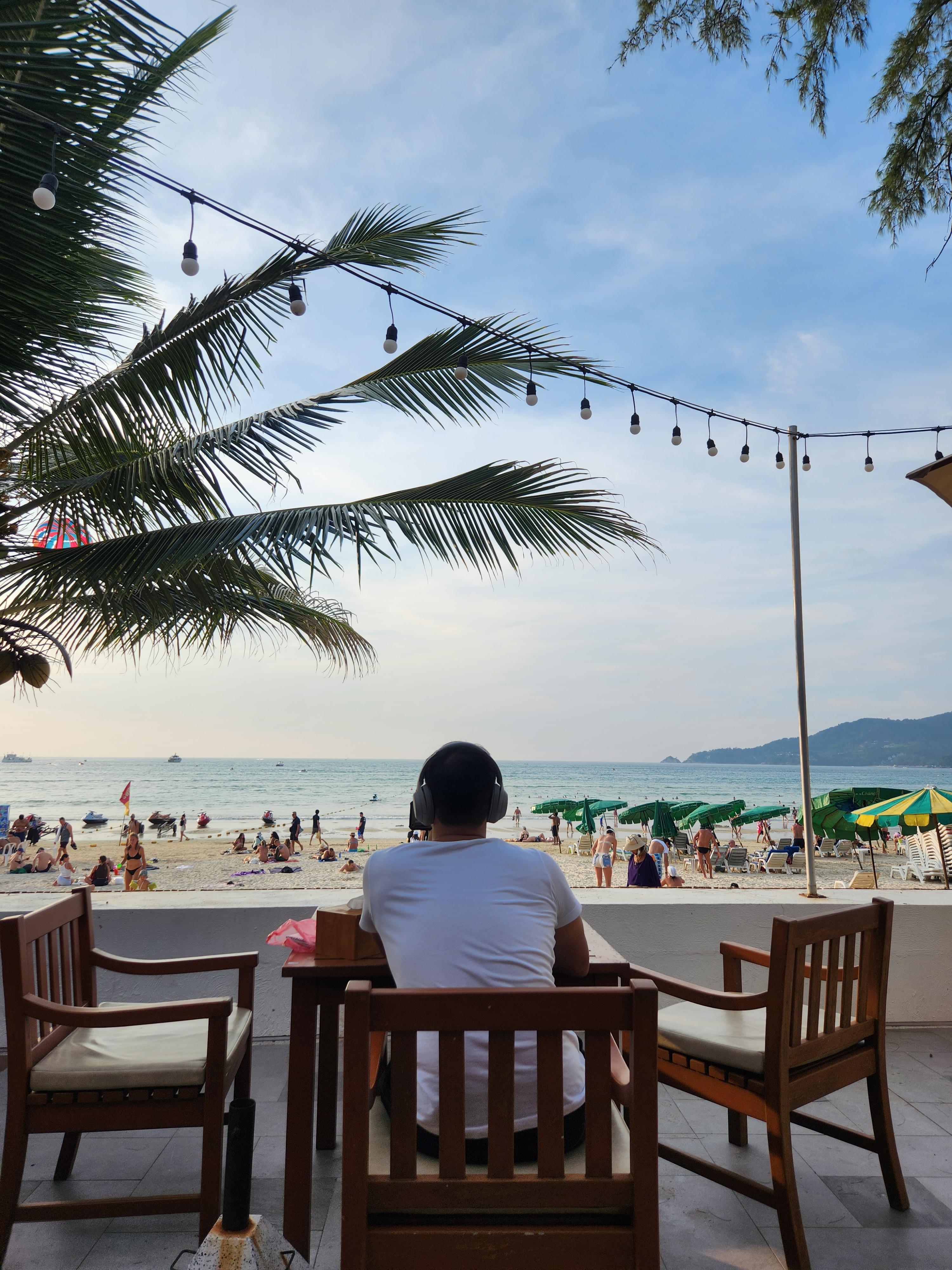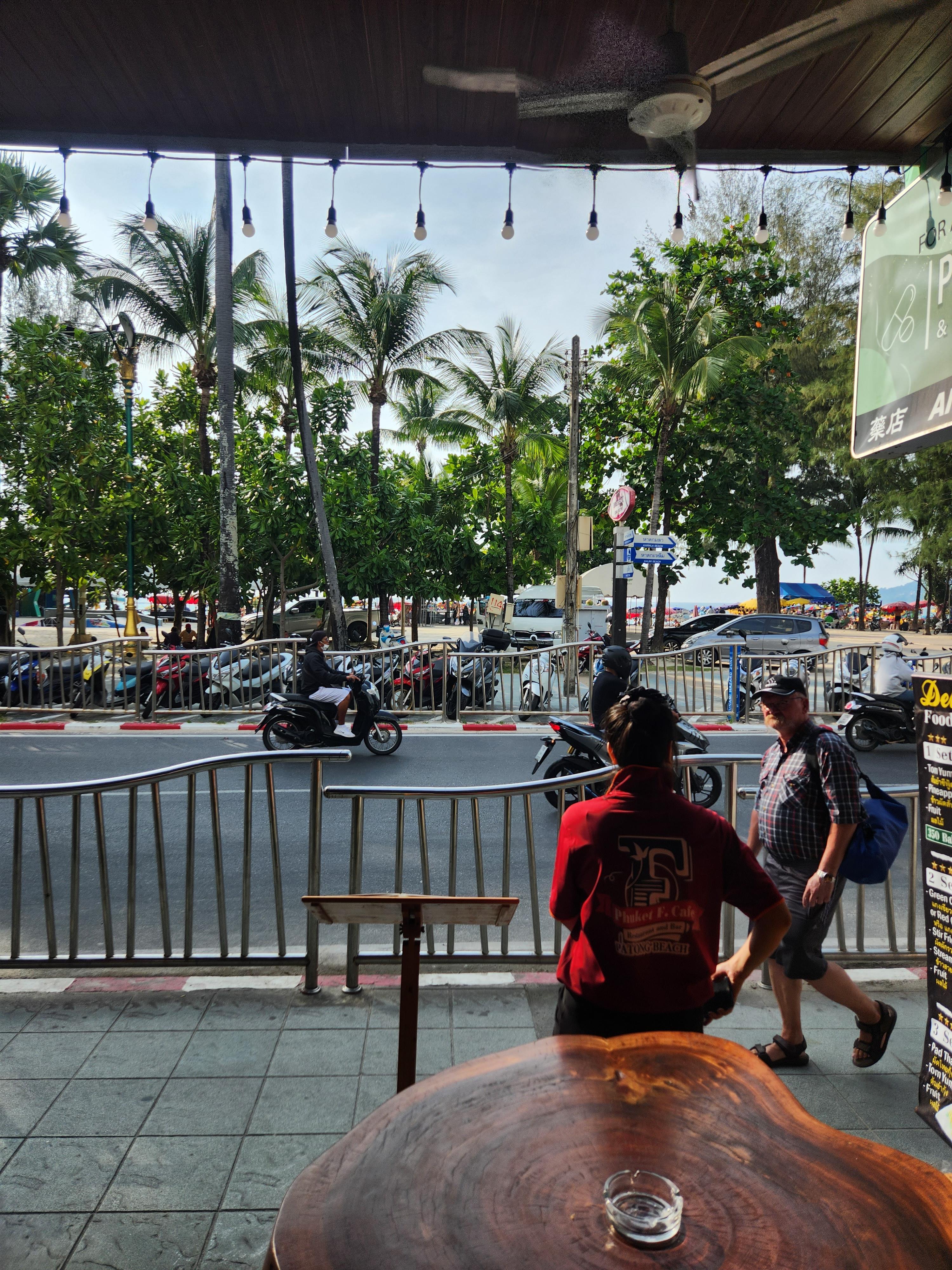 빠통비치 끝까지 왔을때 야외 테이블이 있는 카페에서 커피한잔했다. 아이스 아메리카노, 카페라떼 두잔해서 250바트..!