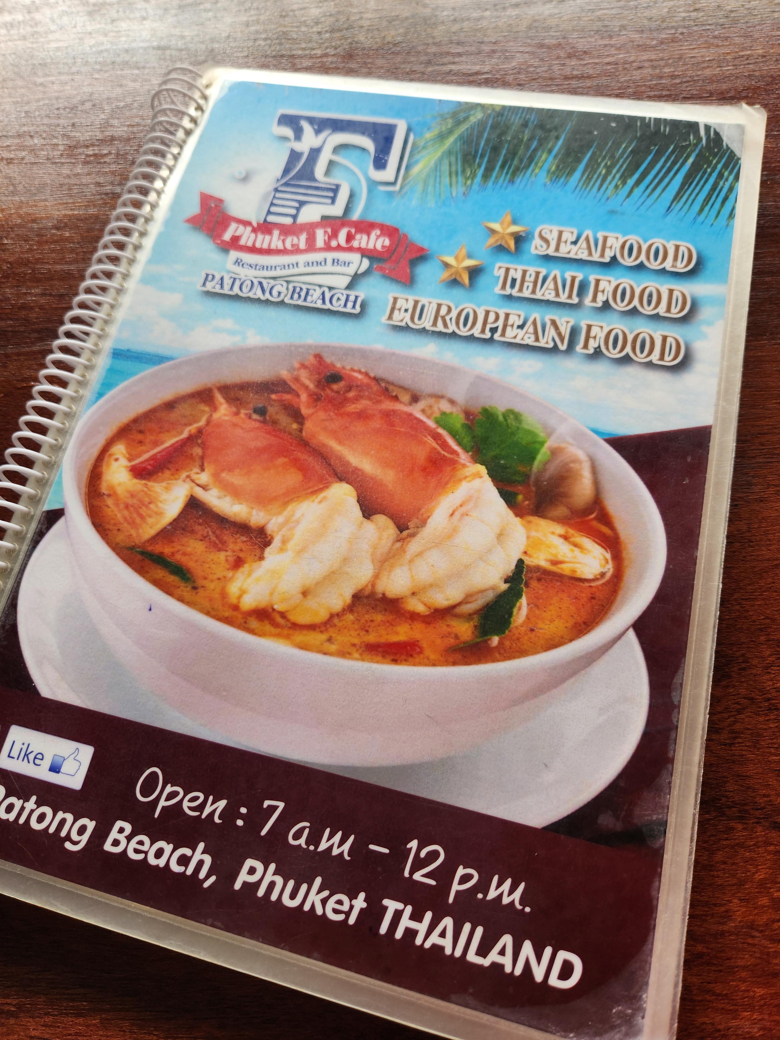 다행히 찍어놨던 메뉴판..ㅋㅋ 분명 빠통비치 F.Cafe 라고 되어있는데.. 구글에 아무리 쳐도 안나와..! 카드 승인 거래처는 PHUKET BEACH F CAFE & RESPHUKE 로 나오긴한다. 참고로 여기 카드결제가 된다.