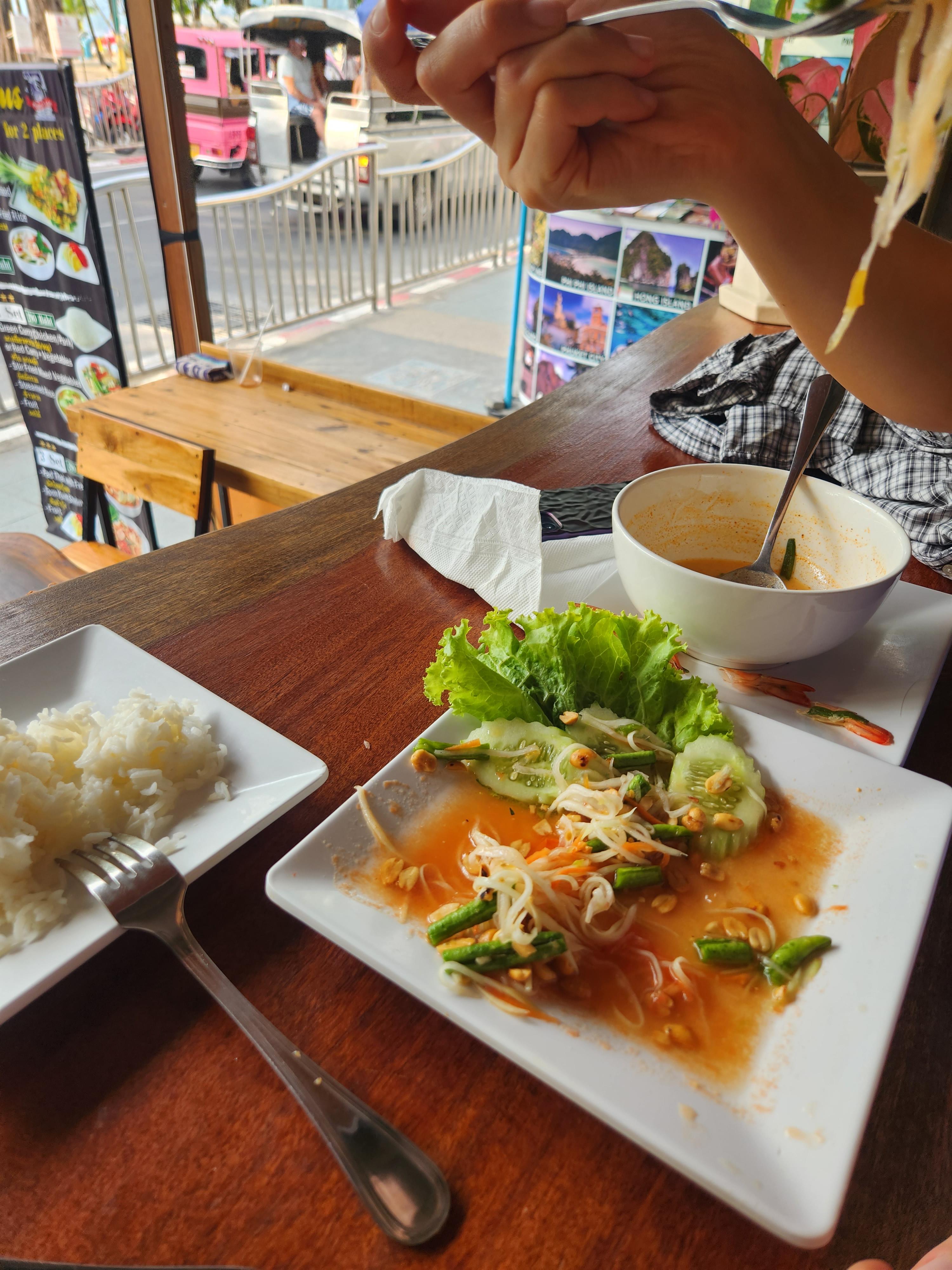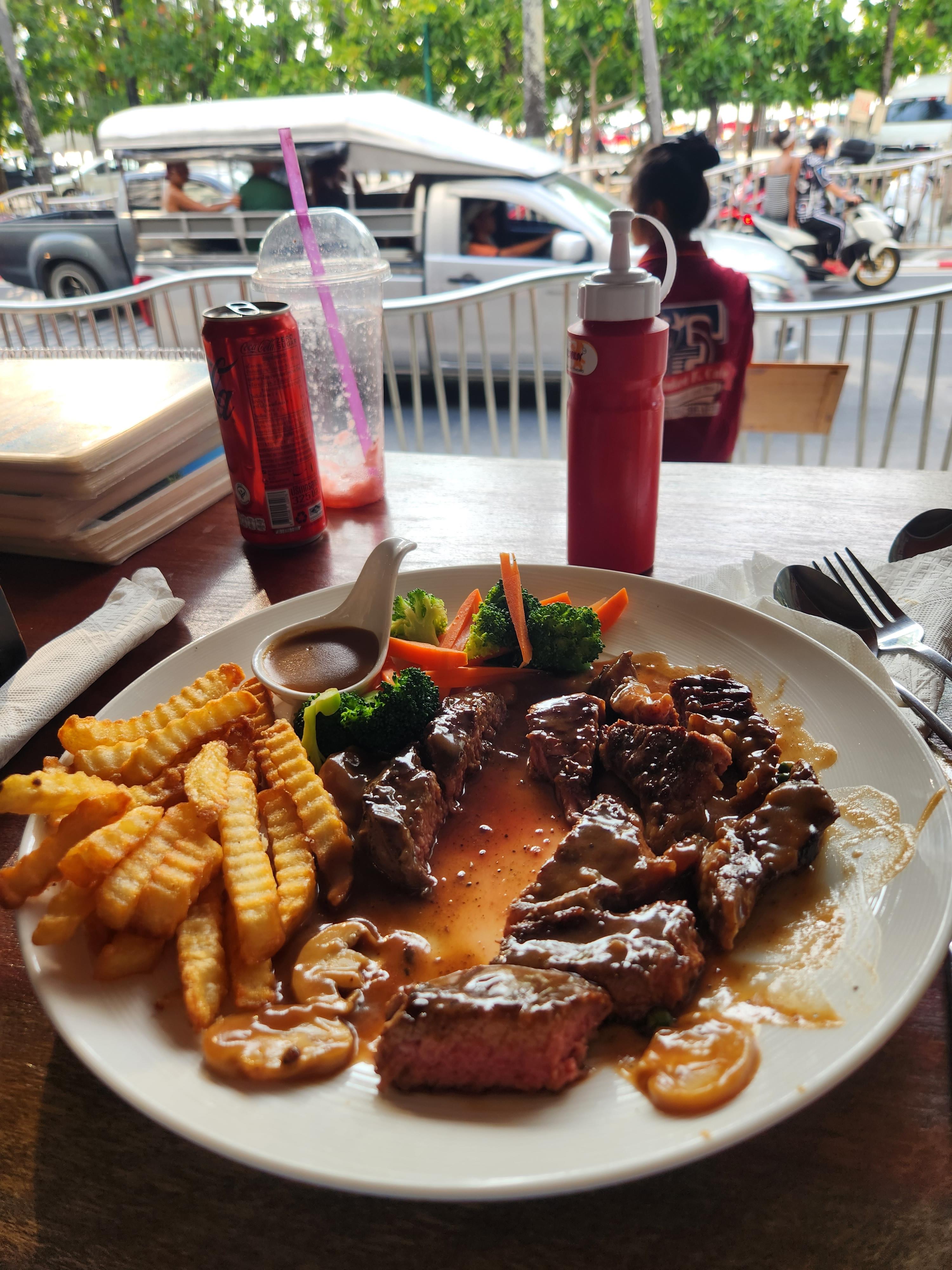 여자친구는 현지식을 잘먹어서 이름모를 태국음식 2개 주문 총 메뉴 3개시켜서 1056바트 나왔고 약 3.9만원정도가 나왔다. 아 머야ㅡㅡ 물가 싸다고해서 왔는데 한국이랑 똑같잖아! (여행내내 여기만 그랬다) 현지인거 치고 좀 비싸긴한데 스테이크 두툼허니 괜찮았고 현지메뉴 2개도 아주 맛있었다고 한다. 창렬은 아니고 딱 가격값하는 식당이라고 보면 된다. 음식 퀄은 절대 나쁘지 않았음. 호텔 체크인하고 어디 둘러볼 시간도 없고 싶지도 않고 빨리 배부터 채우고싶을때 오는걸 추천한다.