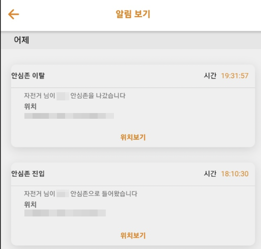 그리고 안심존들을 등록할 수 있는데 안심존에 들어가거나 나갈때 폰으로 알림이 온다. 이거 정말 좋은기능이다. 나는 내가 자주 자전거를 세워두는 회사앞이랑 헬스장 앞 두개를 등록했는데 회사에 있다가 만약 누군가 내 자전거를 가져가면 바로 알림이 오는것이다..! 뭔가.. 이제 훔쳐가도 잡을 수 있을 것 같은.. 그런 자신감이..!