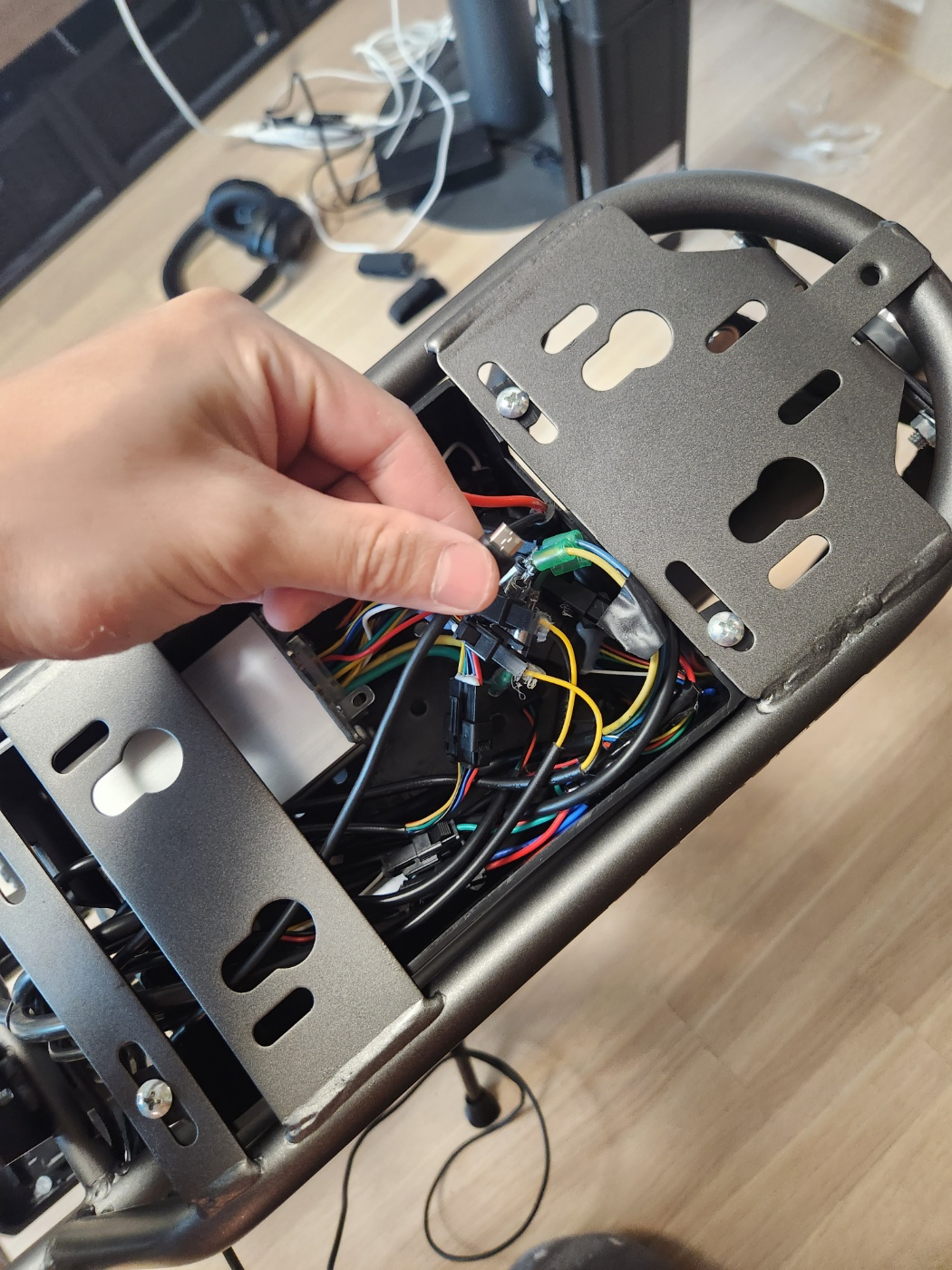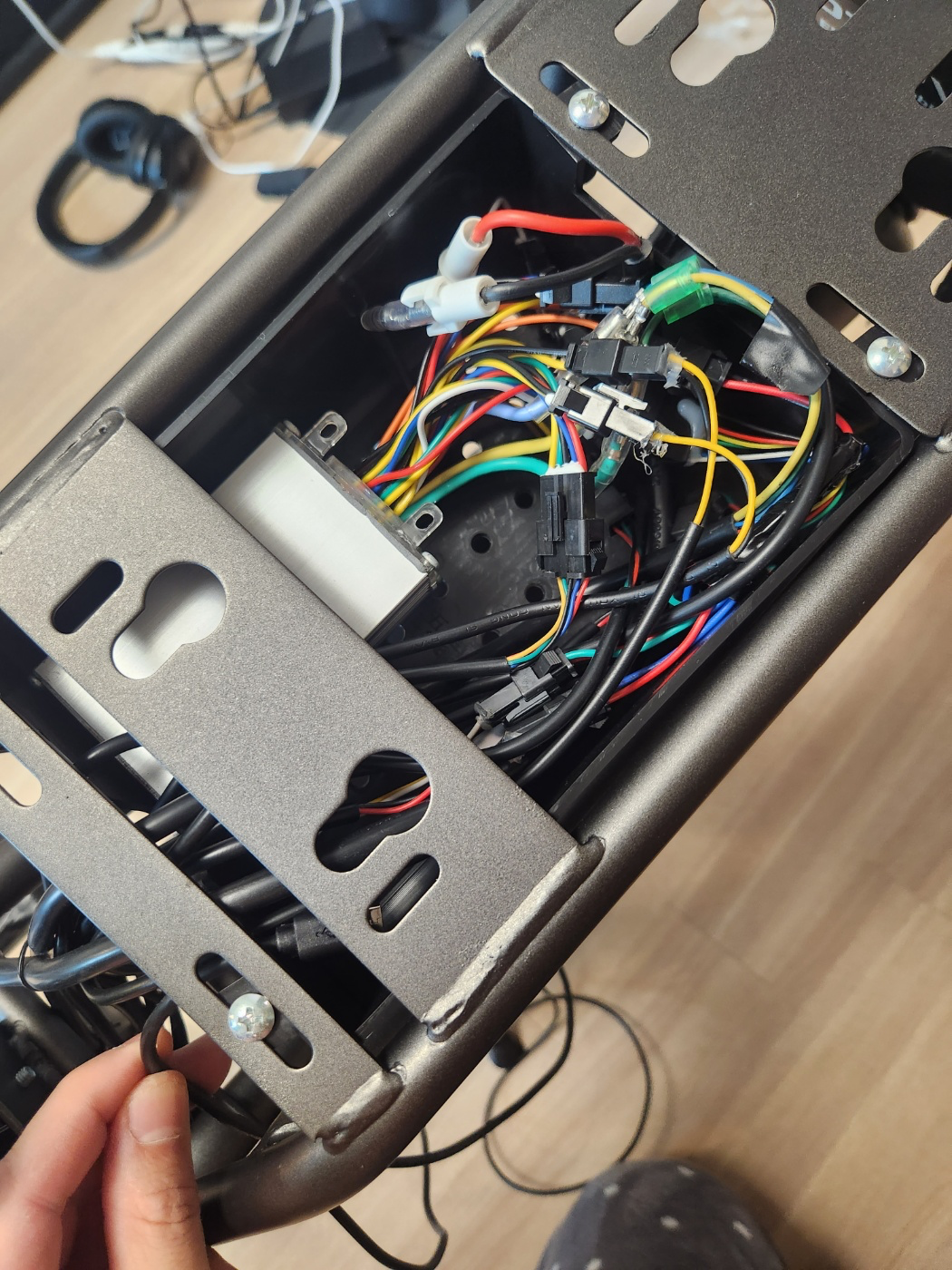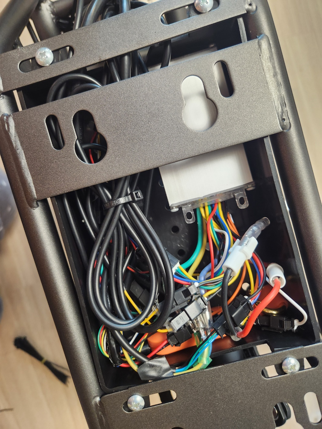 저기다 넣으면 내가 걱정한 모든게 해결된다! GPS가 안보이고. 2열 안장밑에 있기떄문에 십자 드라이버로 2열 안장을 분리해서 해체하지 않는이상 GPS가 있다는 사실도 모를꺼고 좀도둑이 현장에서 가져가는 일도 없을 것이다. 전원 공급의 경우 1열 안장밑에 케이블 작업을 하면 이상하지만 2열 컨트롤박스는 기존 배선들이 지나가기 때문에 케이블 작업을 해도 전혀 이상할게 없어보였다! 마지막으로 상자 안에 공간이 있기때문에 방수와 이물질 보호는 덤!