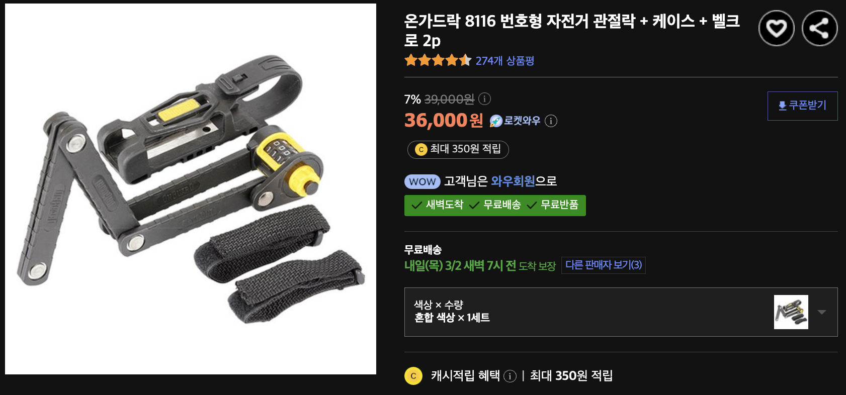 일단 내 주력 보안장치는 바로 이놈이다. 관절락이고 일단 보관이 편해서 샀고 튼튼하다. 근데 바퀴랑 몸체 전체를 감싸기엔 짧아서 바퀴 쪽에 족쇄처럼 거는 용도로 주로 사용한다. 간혹 자전거를 시설물에 묶지 않는 경우 자전거 째로 가져가는 도둑넘들이 있는데 전기 자전거는 후미가 굉장히 무겁기 때문에 앞바퀴만 살짝 들고 이동하는게 용이하다. 따라서 족쇄형으로 잠굴꺼면 무조건 뒷 바퀴에 잠구는 것을 추천한다.그래야 뒷바퀴를 들고 가져가는 케이스를 줄일 수 있다.