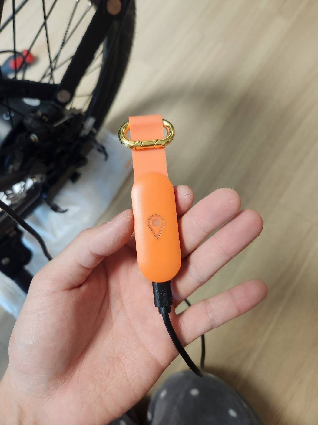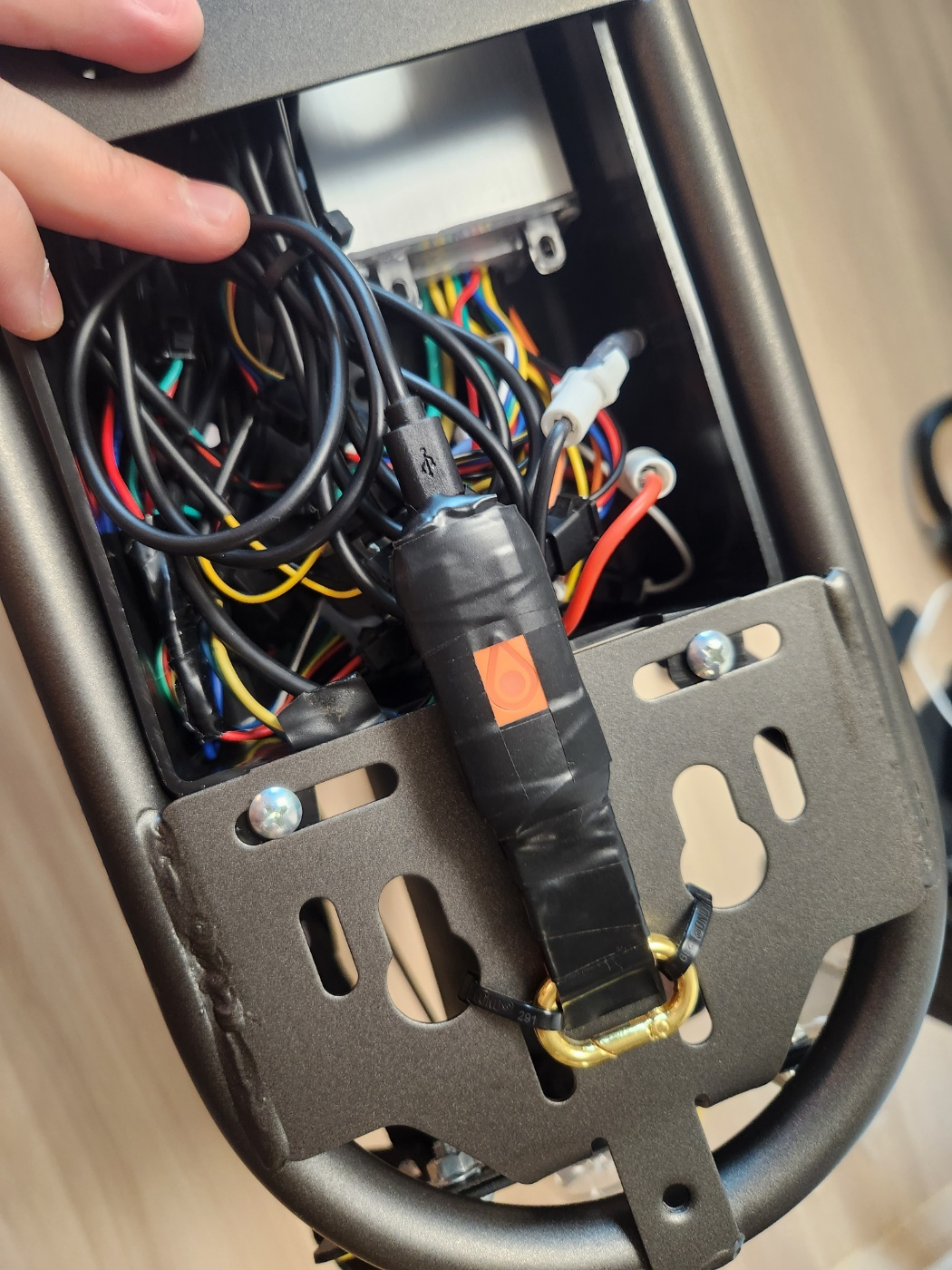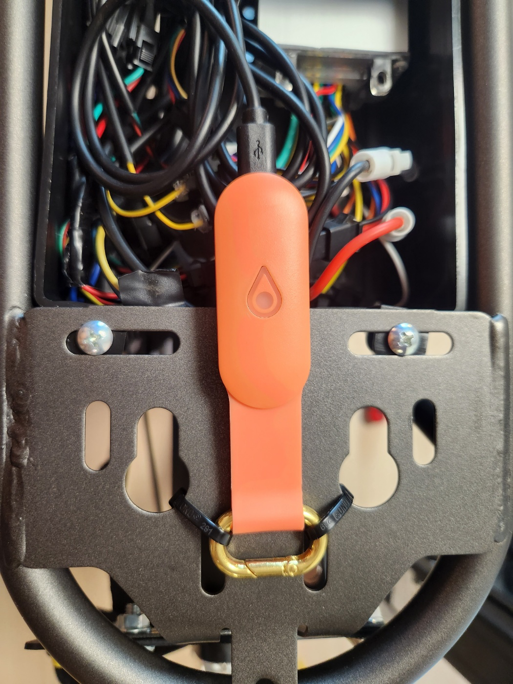 자 요기가 USB 충전 케이블 단자다. 자전거 시동을 켤때마다 운행중에 키코 단말기를 충전 할 수 있도록 안중 뒤편 컨트롤 박스까지 전력선을 따서 전력을 공급할 예정이다. 완충시 3일정도 동작한다고 하던데 그냥 신경안쓰고 자전거 타고다니니까 항상 충전돼서 배터리가 계속 100% 더라..! 유선으로 연결해두면 전원 걱정은 안해도 될 듯 하다.