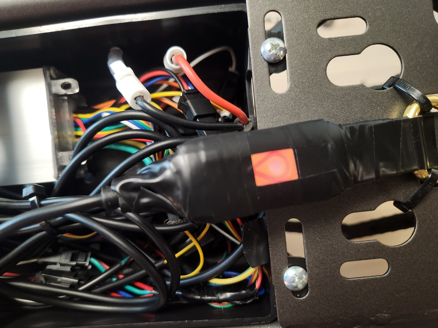물론 안장 덮으면 안보이겠지만.. 혹시나 아래서도 한번 비춰볼 섬세한 도둑이 있을까봐 전기테이프로 위장을 실시했다. 위장외에 5핀 전원부 방수처리까지 같이했다 ㅎㅎ. 혹시나 키코 단말기의 상태는 봐야함으로 메인 LED등은 감싸지 않았다.