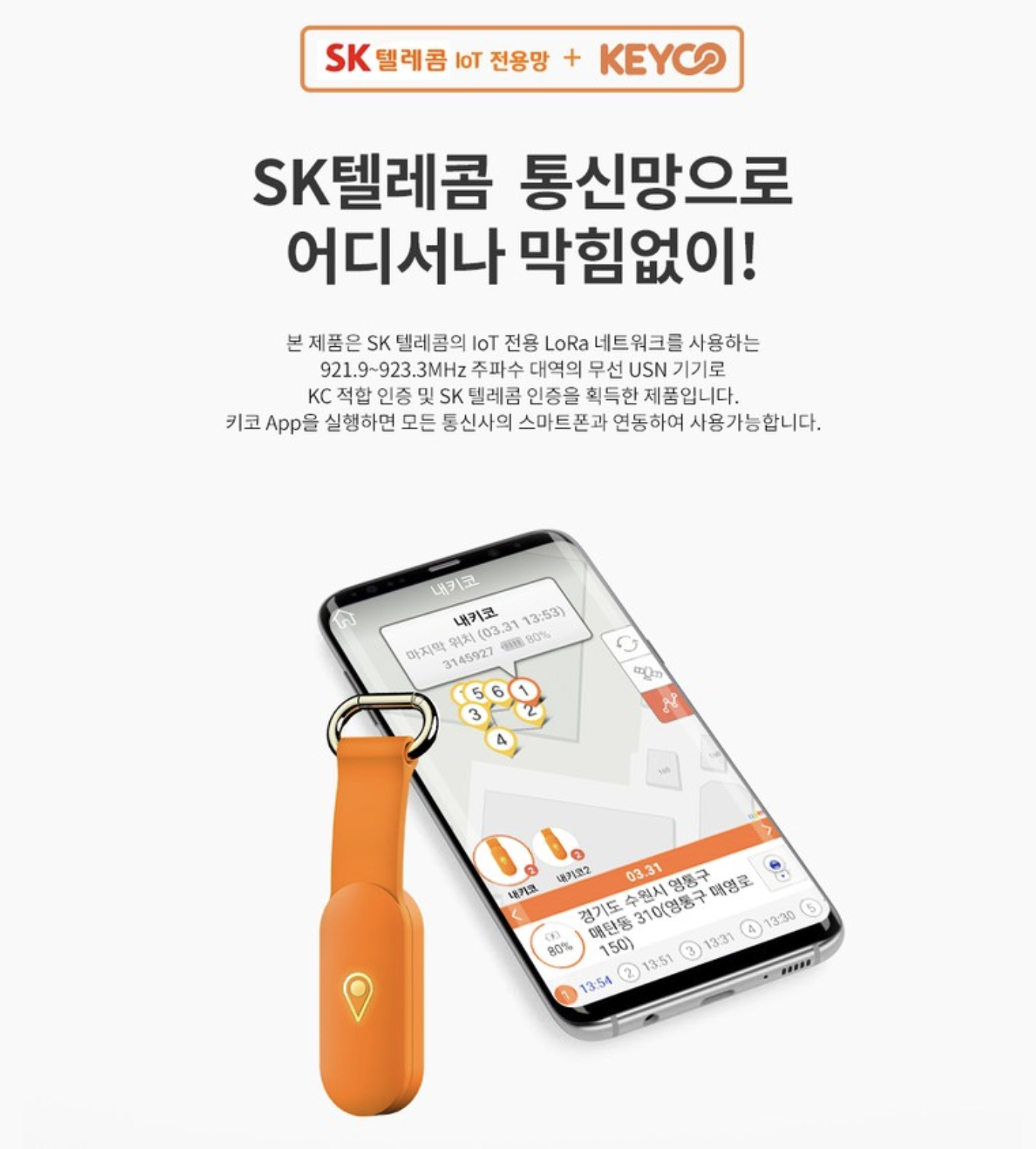 찾아보니 이런 제품이 있더라. 키코 GPS 트래커라고 SKT의 Iot 전용망인 로라(Lola)망을 사용하는 제품이다. BLE 처럼 저전력으로 위치정보를 송수신 할 수 있는 제품으로 배터리는 완충 기준 3일정도 된다고 한다. 단말기 가격은 비싼 편이다. 근데 머.. 중국산 사느니.. 한국산 + SKT 에서 서비스하는 망을 사용하는게 더 좋잖아..! 그리고 한국어 지원되는 전용 앱도 있어서 바로 구매..!