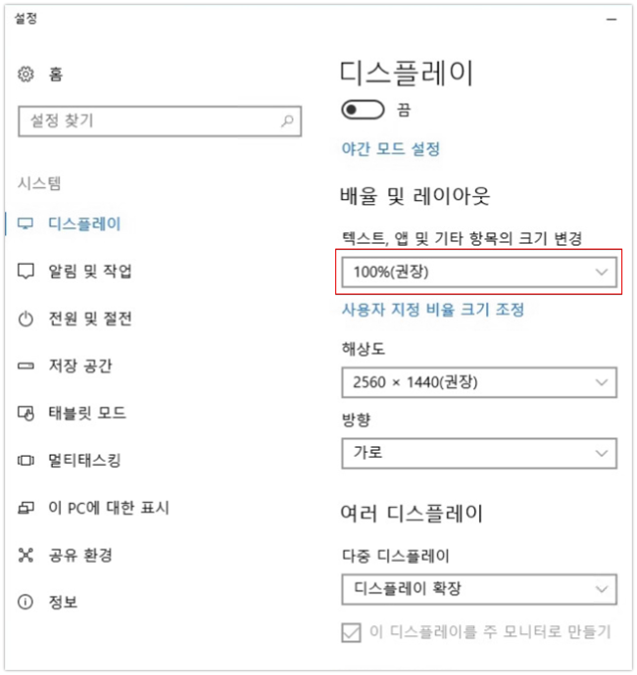 설정-시스템-디스플레이 화면을 보면 화면 배울을 조절할 수 있다. 기존 배율에서 다른 배율을 순회해서 원래 배율로 돌리면 된다. Ex) 125% > 100% > 125%