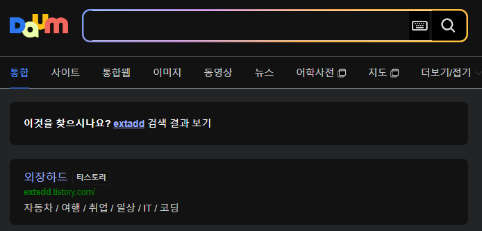 다음 검색창에 본인의 블로그를 검색해보면 된다. 지금은 정상화 되었기 떄문에 검색이 되지만, 저품질 블로그일때는 위 화면에서 조회되지 않는다.