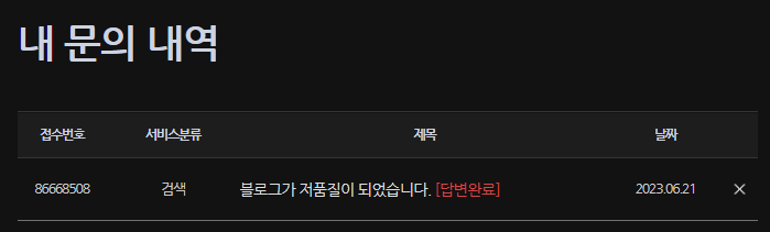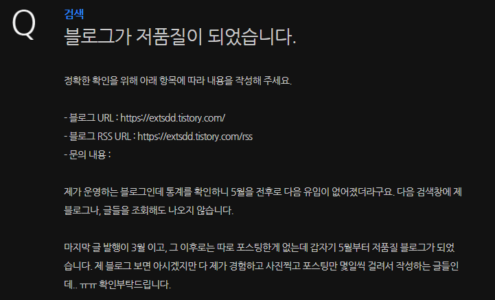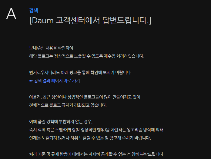 결과는 2시간만에 응답이 왔다. 사실 저 응답 오기전에 그냥 다음 검색창에서 내 블로그가 조회되길래 아 해결됐구나.. 하고 이렇게 알았는데.. 저 응답메시지는 엄청 뒤에오더라... 아마 내 블로그가 5월에 뭘 한건 없지만. 티스토리 자체적으로 저품질거르는 로직이 뭔가가 수정되었고, 그 기준에 내블로그가 들어가지 않았을까.. 생각해본다.
