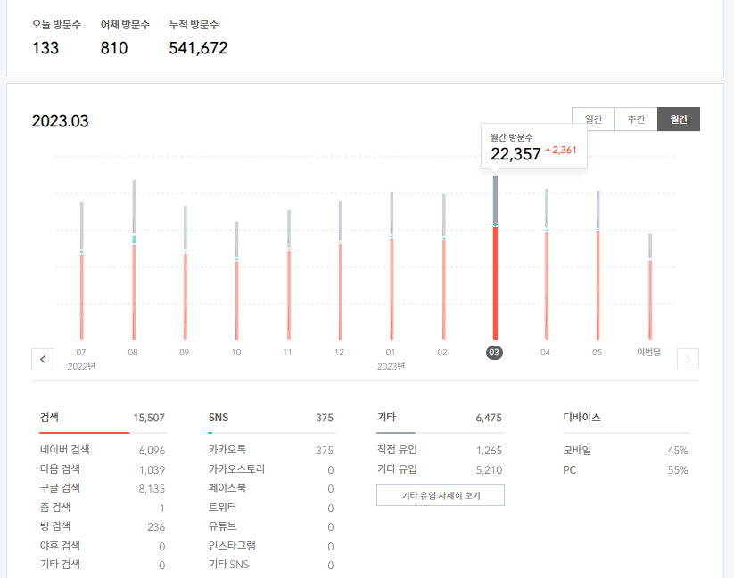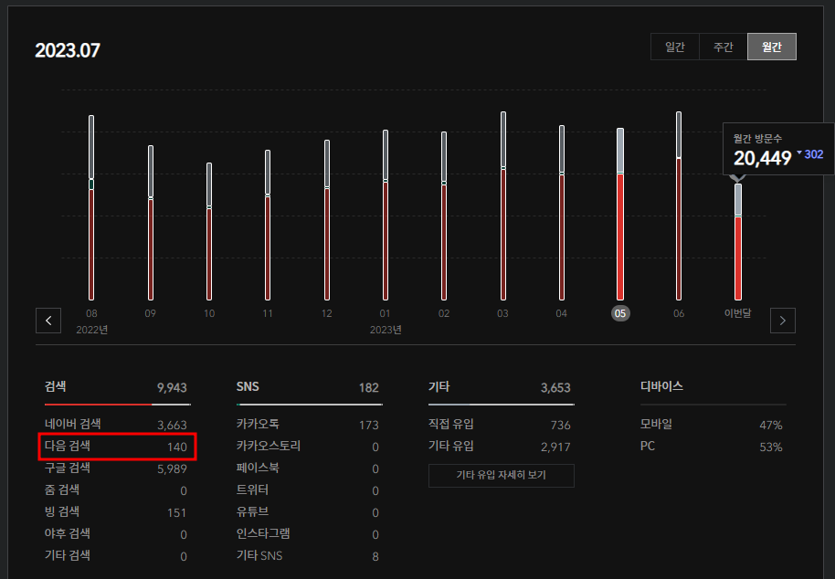 6월 말쯤에 해결이돼서 지금은 다음 유입이 어느정도 있긴 한 상태인데.. 카카오 데이터 센터 불나고 티스토리 폭파됐을때처럼...검색노출은 처음부터 시작인가보다.. 기존 1000명 수준이었는데 지금 7월말 대략 추정치는 300명이 채 되지 않을듯 보인다. 일단 완전 정상화까지는 좀더 기다려봐야겠다.