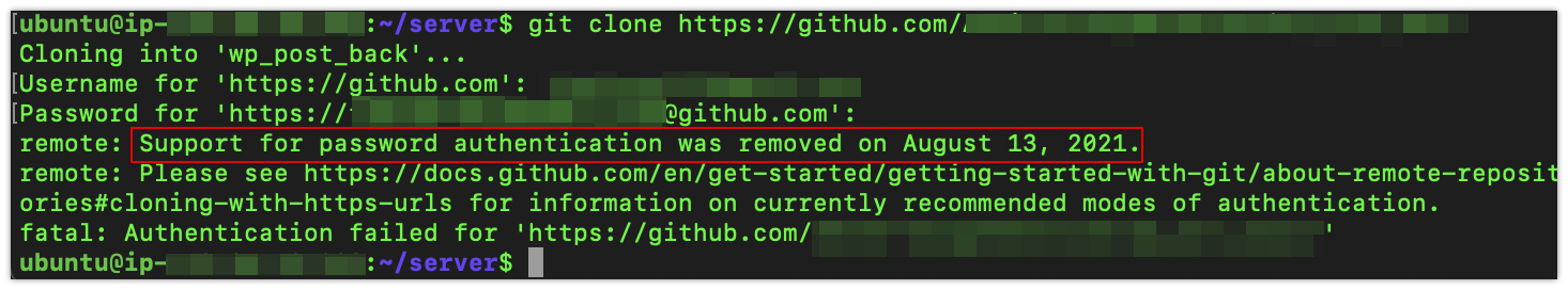 현상 git 저장소에 있는 코드를 라이트세일 서버로 옮기려는 도중 문제가 생겼다. git clone 명령어를 이용해 저장소를 복제하기위해 로그인 정보를 묻기에 내 계정정보를 입력했으나 아래 오류가
