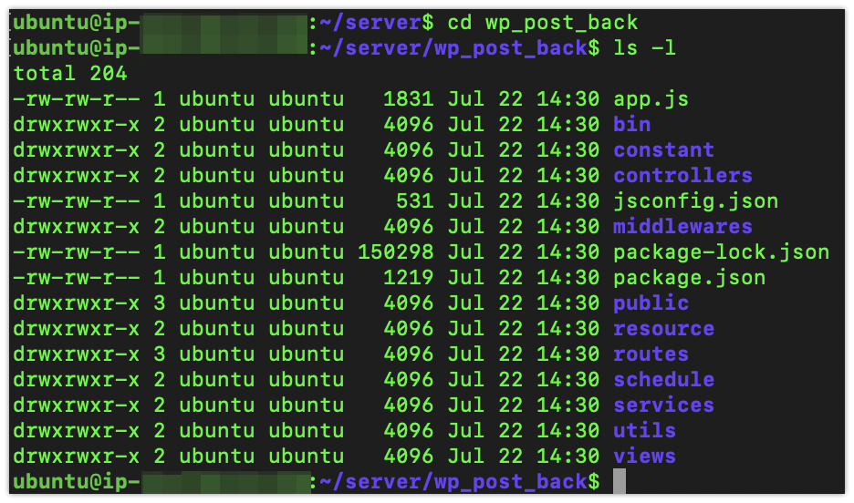 생성된 디렉토리에 들어가보면 nodejs express로 만든 backend 프로젝트가 잘 받아져있는 것을 볼 수 있다.