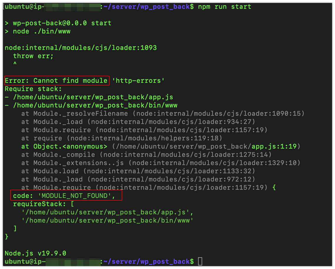 원인은 말그대로다. 앱을 실행하는데 프로젝트 디렉토리에 앱을 구동할 관련 패키지가 없다는 뜻이다. NO! Module! 즉, 패키지 모듈이 없는데!?! 일단 저기서 친절하게도 알려준다. http-errors 패키지가 없다고. 그럼 해당 패키지를 설치해주면 된다. 보통 이런 케이스가 많이 생기는 케이스는 경험적으로 아래 두 케이스다.