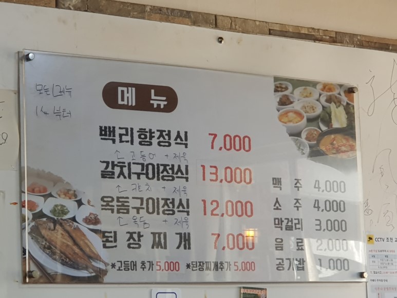 메뉴는 크게 4가지다 백리향정식은 고등어구이, 갈치구이, 옥돔구이, 그리고 된장찌개 간단히 먹을 수 있어서 점식 먹기에 좋다.