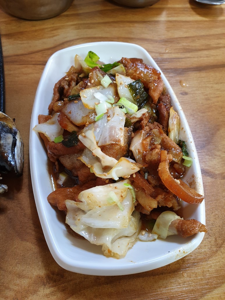 음식이 나왔다. 위쪽에 포개진게 고등어 2마리가 붙어있는거고 밑에 황토색 4조각 나있는게 갈치 1인분으로 나온거다. 그외에 생선 우측에 제육이 나오고 공기밥, 된장국이 1인당 같이 나온다.