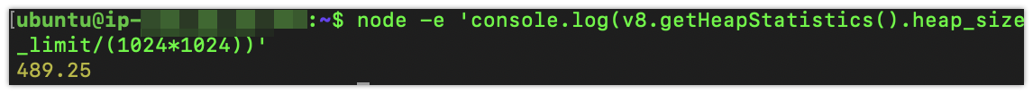 node -e 'console.log(v8.getHeapStatistics().heap_size_limit/(1024*1024))'