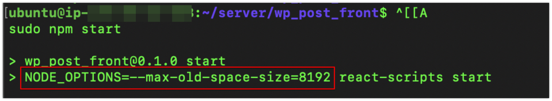 React 프로젝트의 package.json 파일을 열어 start 쪽 커맨드에 위 명령어를 추가해주자. 앱이 구동될때 node 환경변수로 최대 힙사이즈를 8192를 사용하겠다라는 의미다. 아마 내 라이트 세일 서버가 RAM 1기가인데 OS 에서 기본적으로 사용하는 메모리를 제외하고 남는 공간이 자동으로 node 런타임의 힙사이즈로 들어가는것 같다. 지금은 Swap 메모리를 이용해서 메모리를 확보해 놓았기 때문에 잘 될 것이다. 위 처럼 수정후 git/svn에 커밋해주고 서버의 저장소도 최신화해주자.
