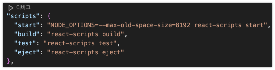 다른 가이드를 보면 터미널에서 위 명령어를 수행해 node 런타임의 힙메모리를 늘려주면 된다고 나와있는데.. 저 방법으로 작동하지 않더라. 해당 터미널에서의 환경변수를 설정한 것일까? react 를 run 하는 터미널에선 여전히 512 메가로 힙이 할당되어있더라... 같은 터미널에서 위 명령어 입력하고 바로 리액트 앱을 run 해도 선언한 힙메모리로 앱이 구동되지 않고 계속 512메가로 구동되었다. 따라서 아예 리액트 앱이 구동되는 시점에 노드 환경변수를 주입할 수 있도록 소스코드를 수정했다. 아래 방법으로 할 경우 앱을 구동시킬때마다 위 명령어를 이용해 환경변수를 주지 않아도되는 장점이 있다.